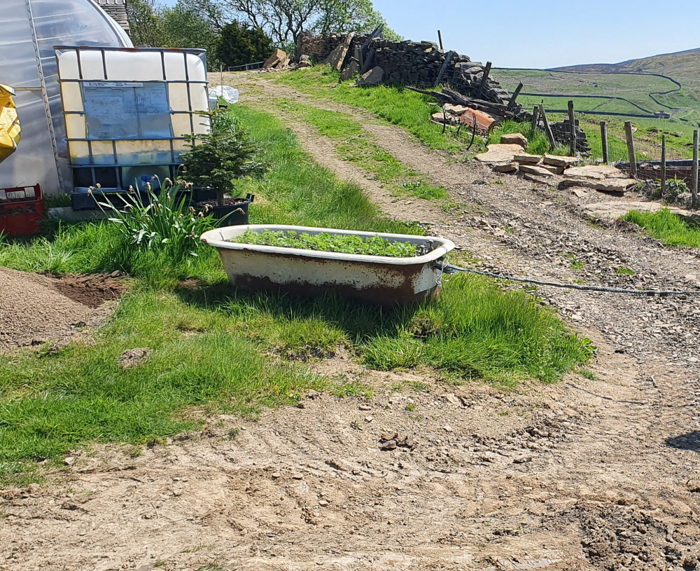 A bathtub of carrots and a thrown out Xmas tree flourishing: