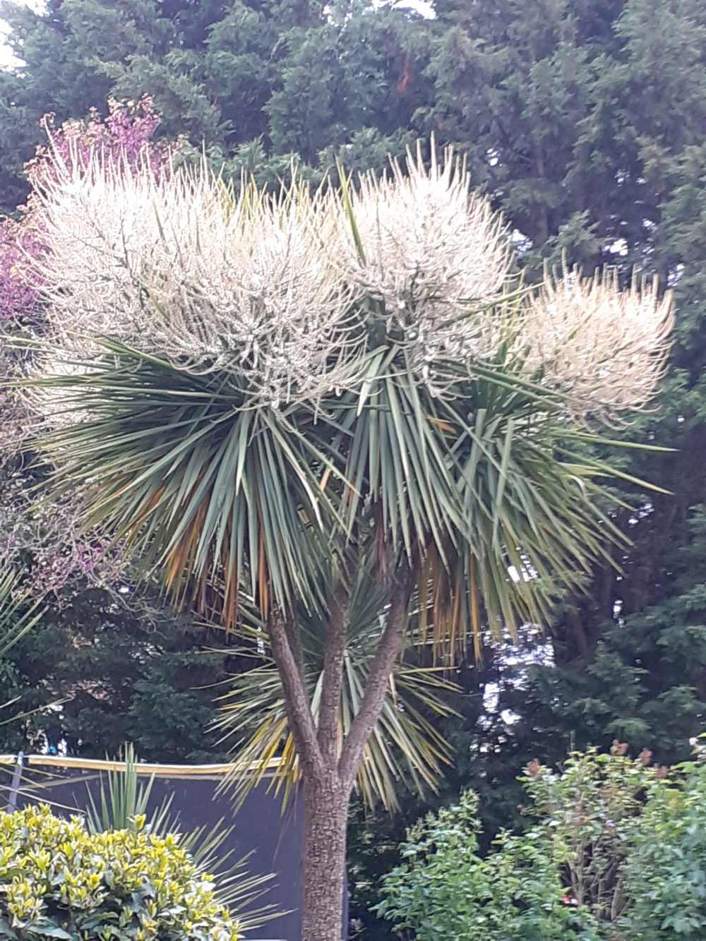 Just a Cordyline doing what Cordylines do ; the expired flower heads can be easily removed as they fade to grey .