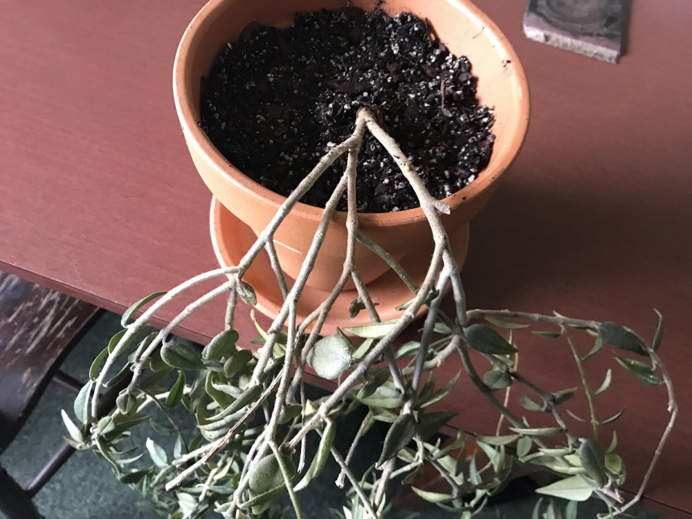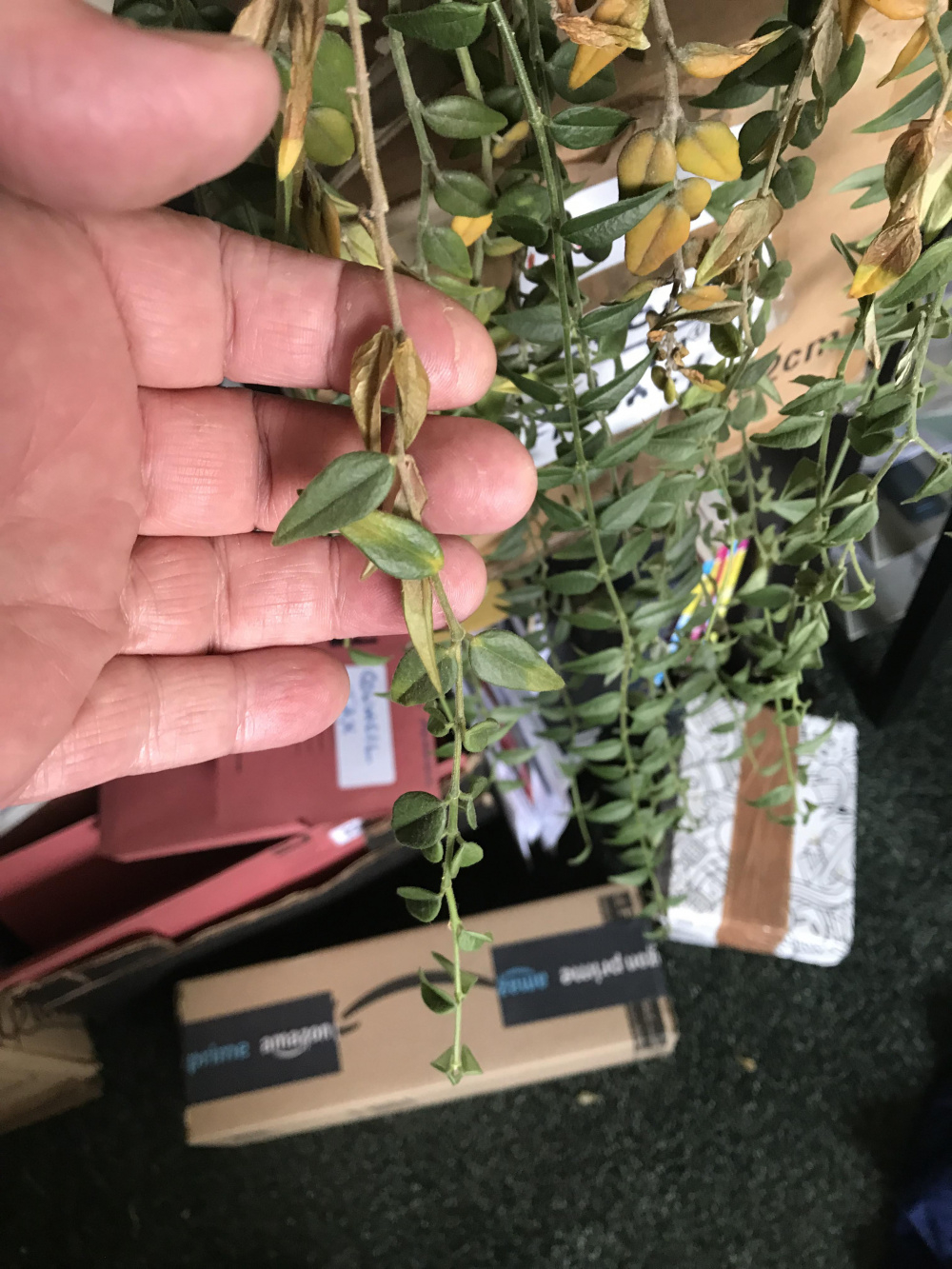 thanks. it's been in that pot for a very long time. the soil is pretty moist, but also, i've read that yellowing leaves is a sign of over watering. if it was only a few, i wouldn't worry, but it does seem to be quite a lot, and also above perfectly healthy leaves, not just at the ends of stems. would it be worth taking those stems as cuttings if i remove the yellow leaves? i don't want to lose healthy leaves. perhaps if i repot it, i can persuade some of the trailing stems to move round a bit. also, if i use a terra cotta pot, that might help with the overbalancing. but then it would dry out more quickly. i'd like very much to get rid of the stones on the top if i can.