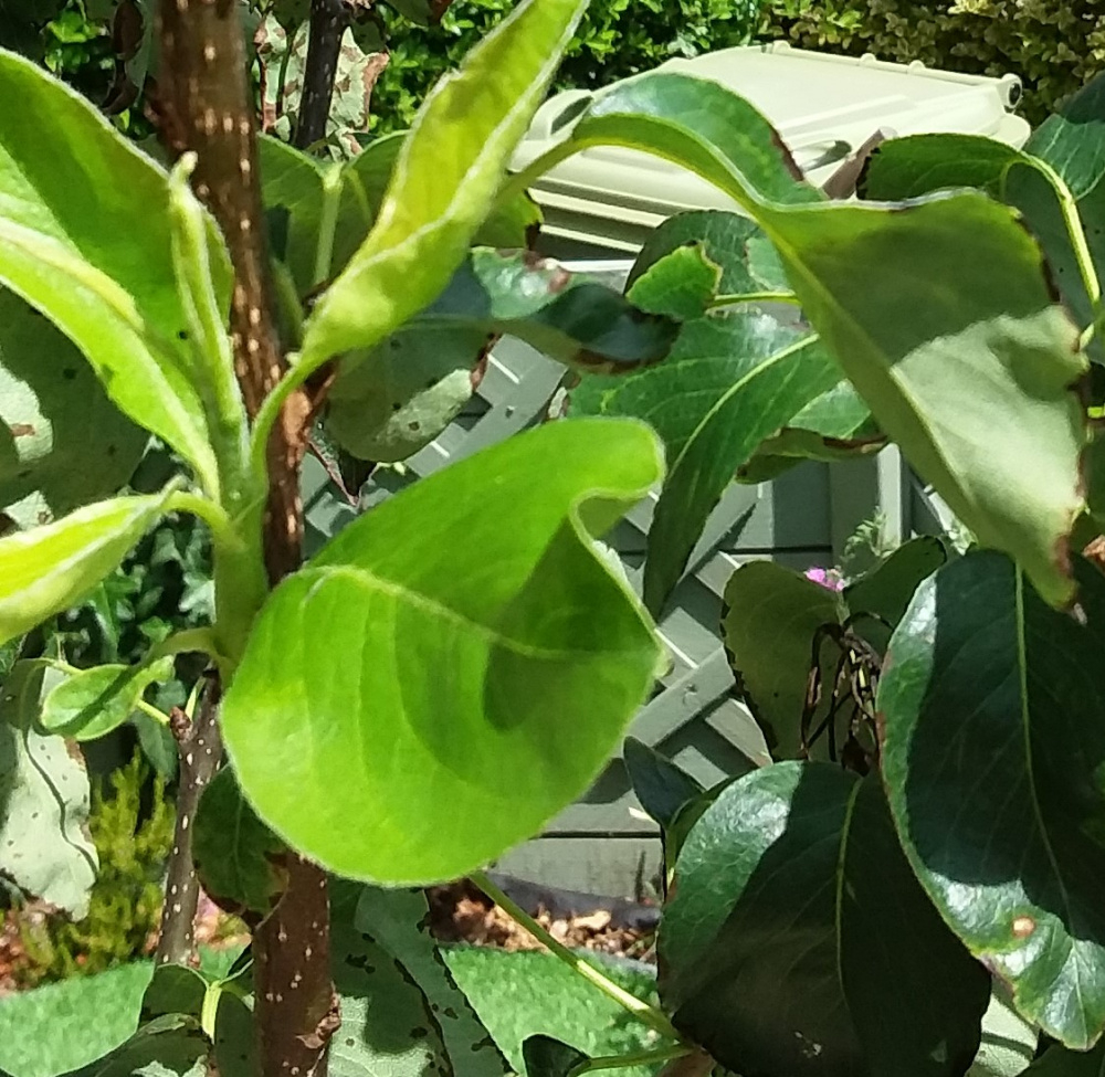 I bought a Concorde pear tree earlier this year and have it in a large container. I have noticed recently that although there is some healthy looking new growth, most of the other leaves have black edges, some with spots on them, also where the few blossoms were these look black and dried up.