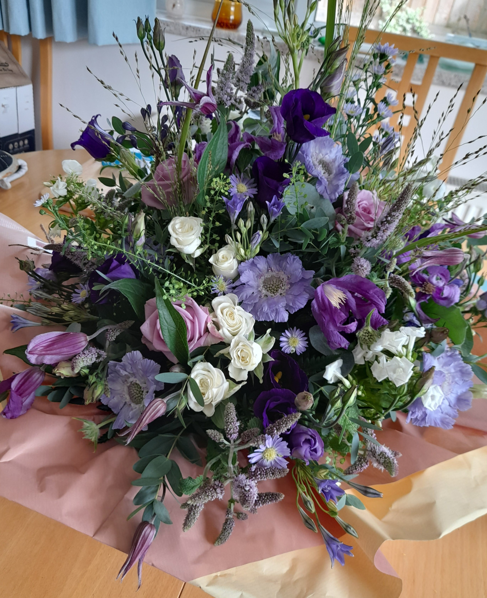 Thanks for all the birthday wishes. To end on a lovely positive note, just look at the beautiful bouquet of flowers that my dearly beloved OH sent me, they were on the doorstep when we got home.