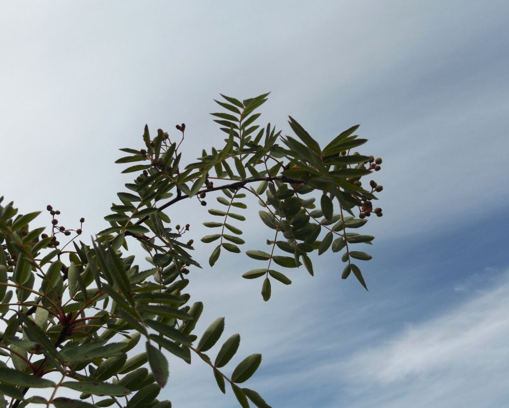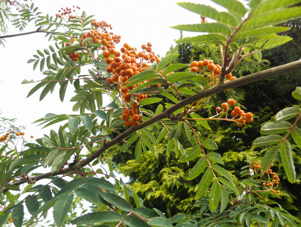 All the rowans round here are producing berries and they're ripening, although that's mainly the native ones which are very common, but I've got one which was a present from the birds, and it still doesn't have a huge amount of fruit, but it's starting to ripen now. It's been in it's site about 2 or 3 years now, but was behind the shed for years before I moved it. It's probably around 8 years old in total. It's a cashmiriana or possibly a vilmorinii as it has white berries fading from a soft pink.