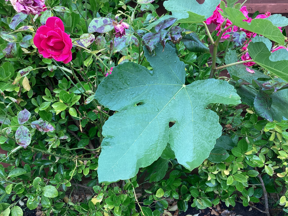Most certainly a fig leaf. You can transplant the tree but the general advice about figs is to keep their roots under control by growing them in big pots or using rubble or root control bags (essentially textile pots you sink in the ground) if you are growing them in the ground. If all else fails you can take cuttings and they root easily (usually).