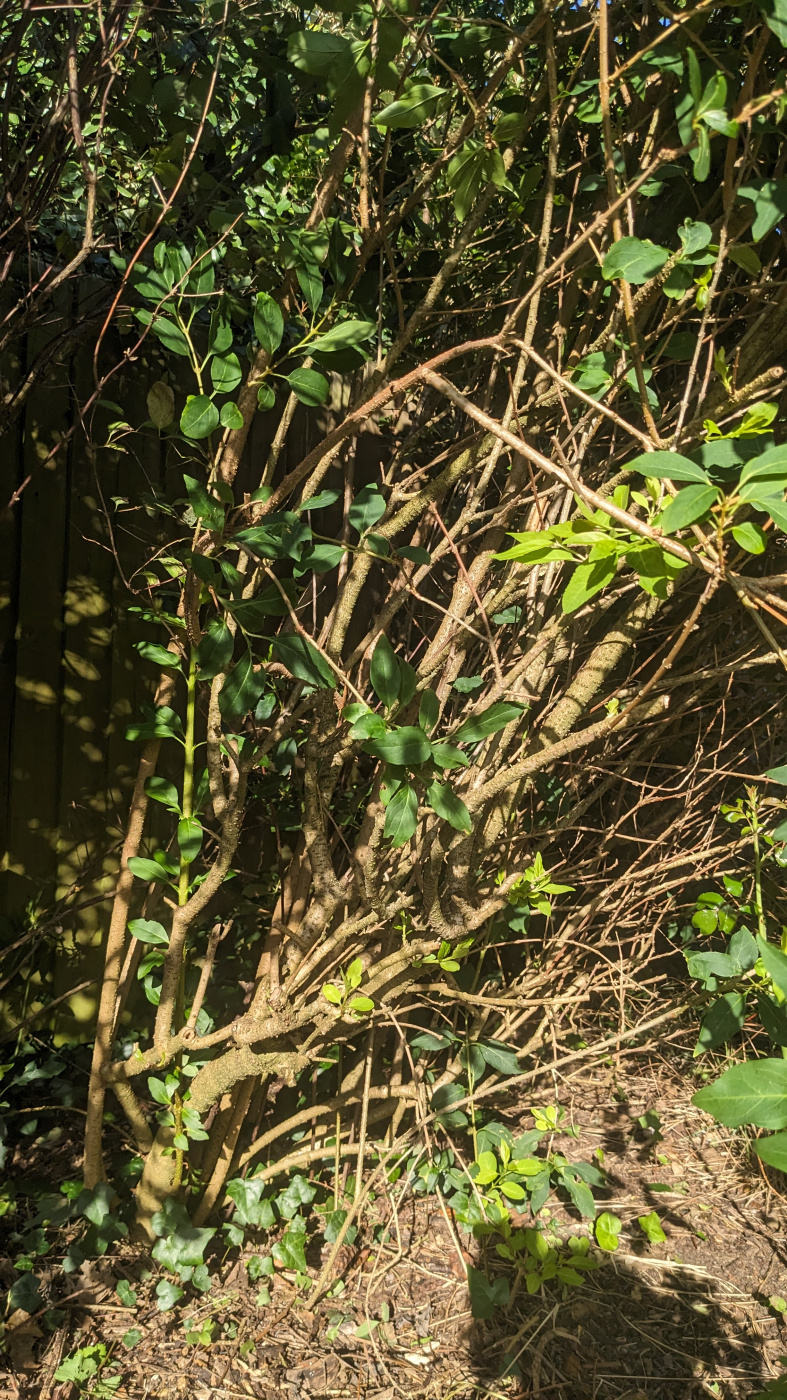 Armed with my pruning saw, my new book and a dose of bravery, I am now up to here. A huge amount of snowberry (I think) was ripped out too. Now the shrubs are thinned, the forsythia is showing a significant lean to the right because it was previously squashed over. Do you think it may be able to get a more balanced shape, in time?
