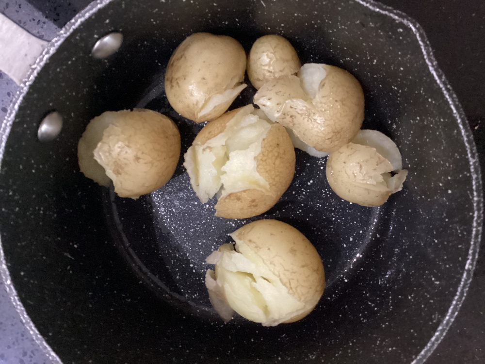I grew some new potatoes for the first time in large containers. They look great but every time I boil them this happens, It’s as if they’re bursting out of their skin, they’re completely inedible! Any ideas what went wrong please?