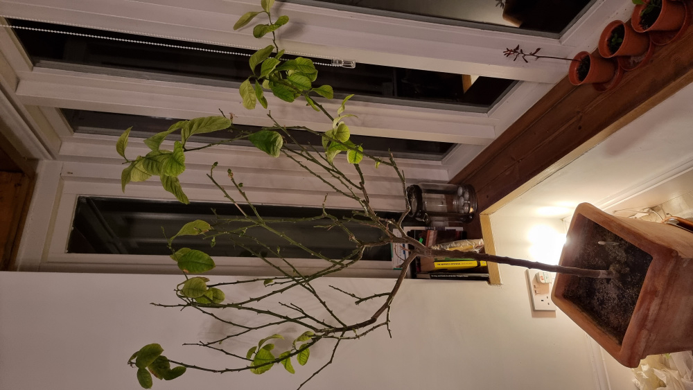 In April it drop almost all of its leaves after a large crop of lemons. I sought advice and repotted it in John Innes No. 3 with mycorrhizal fungi to encourage root growth. A few weeks later 2 branches grew new leaves and there was a lot of new blossoms.