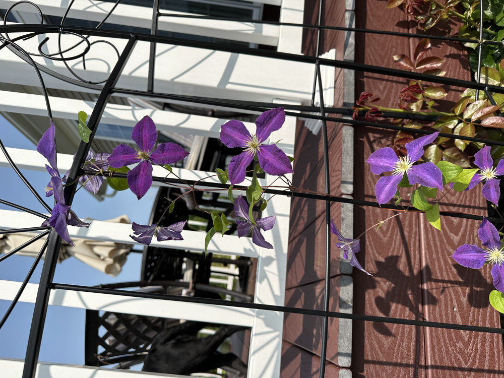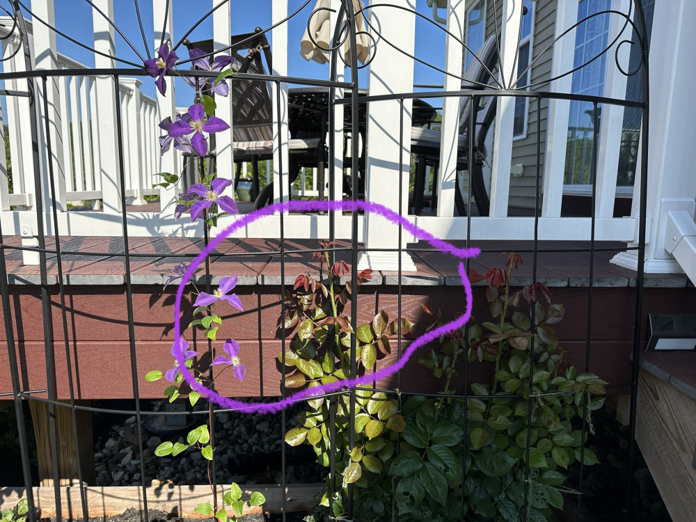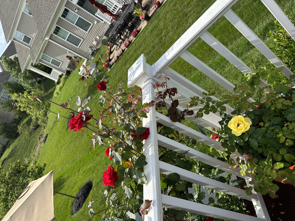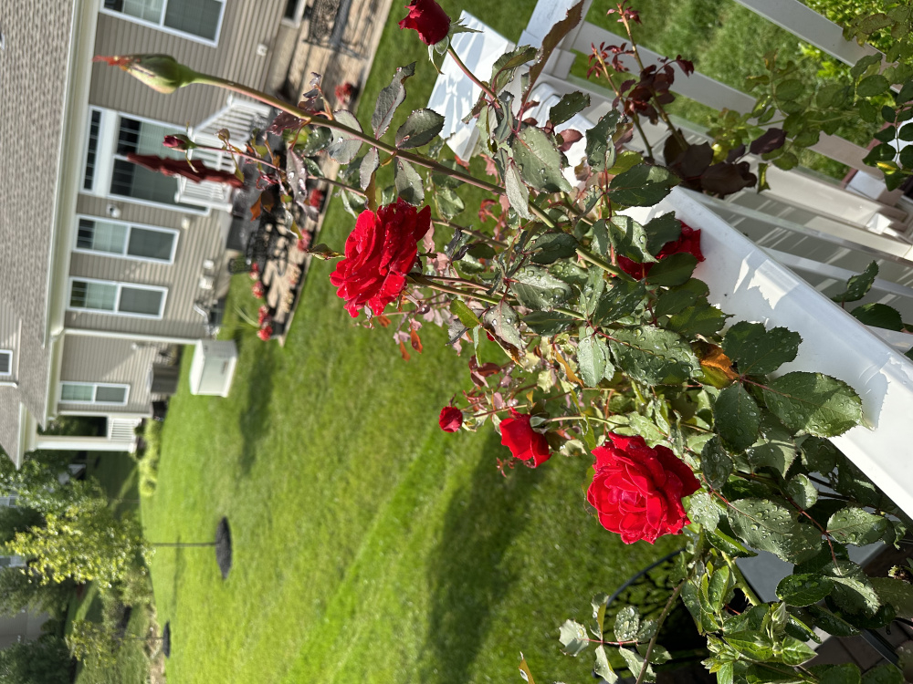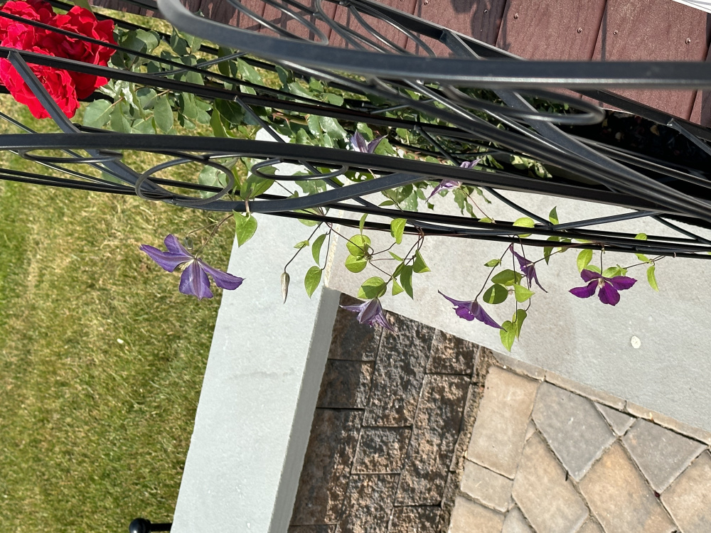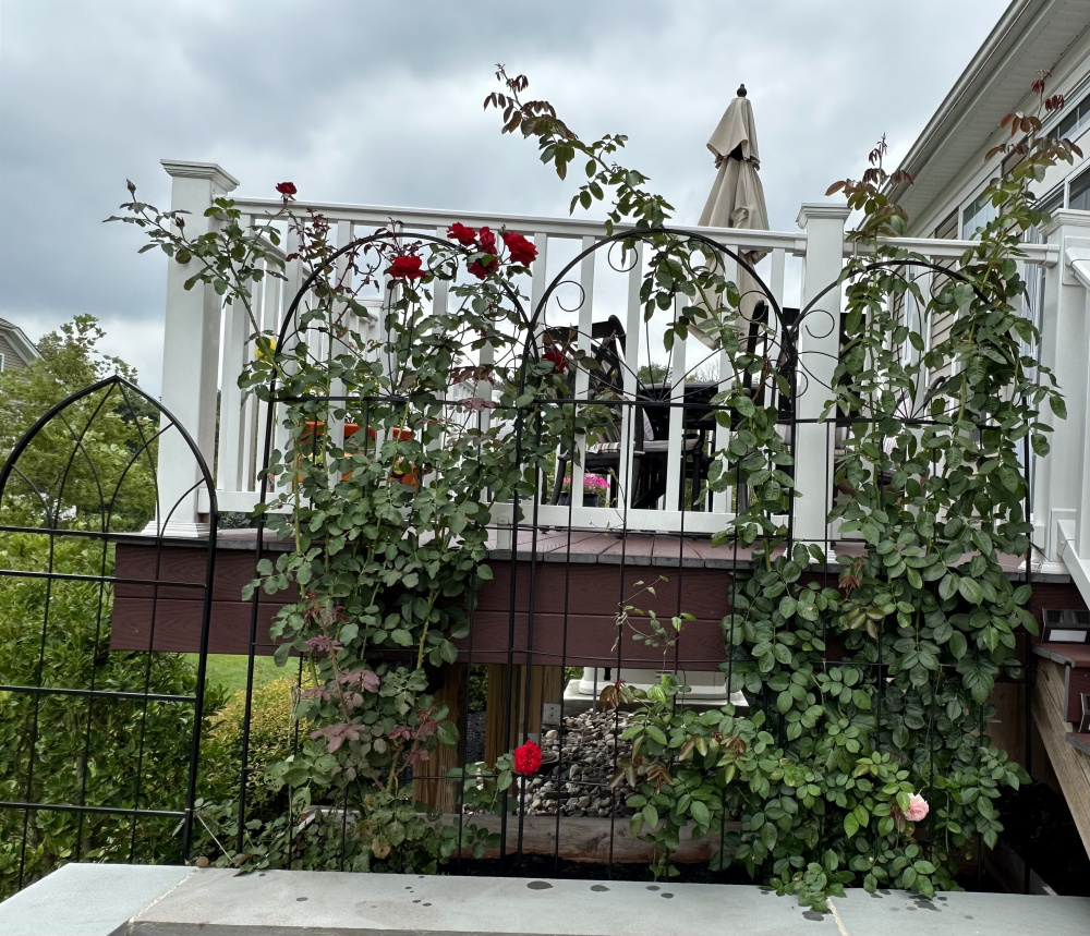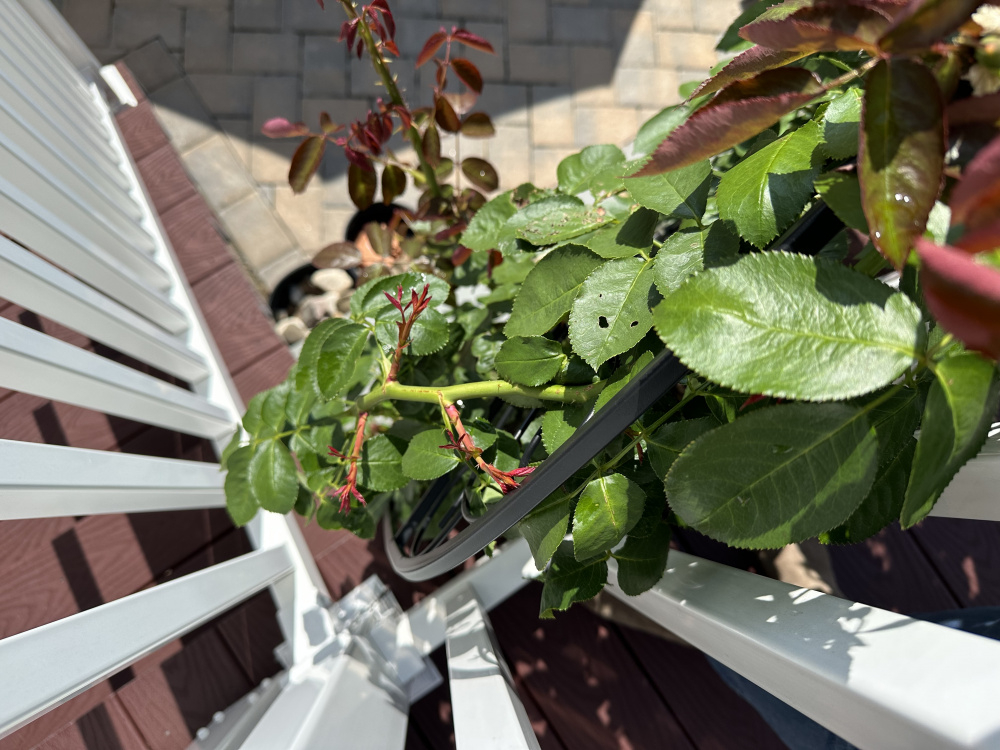 As for moving the Don Juan per Nollie’s suggestion - since I posted it has started coming up over and through the railing so I am getting some beautiful top views. I do have one additional trellis to train it to the right to start wrapping it around the front, and thinking to add one on the left of the Eden climber and train it along the steps. But I will think on moving it… there definitely is space in the middle of the bed in front of the deck where I am allowed to plant, behind some spiria that will provide nice shade for the roots…