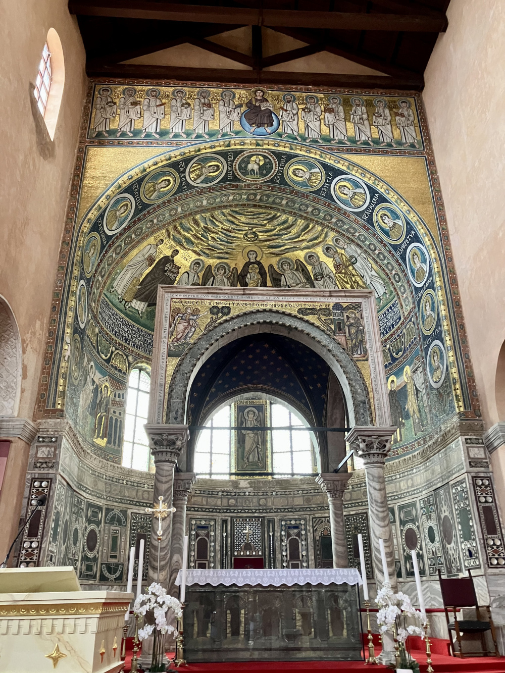 But we really went to Porec for me to visit the ancient basilica there which did not disappoint. It dates from the 5-6th century and is the oldest, largest most complete example of an early christian monastery complex in the world. Lots of exciting (for me anyway!) things to see. Lots of Roman architecture and early christian carvings. Roman frescoes and so many beautiful mosaics. Suspect we would have to go to Rome to see anything else as complete all on one site. Lovely.