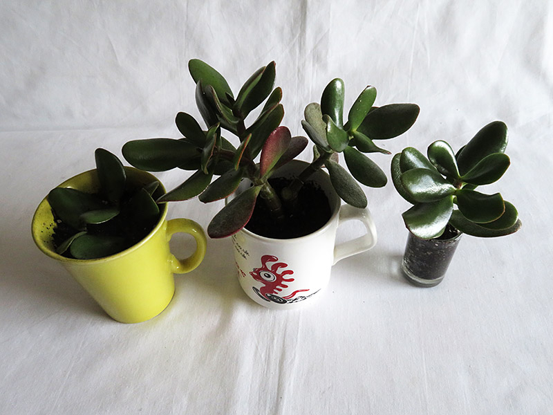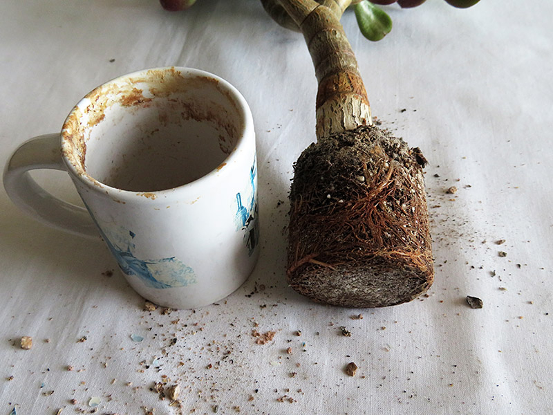 Yes, you could trim the roots and plant the jade into a tea mug but I didn't do it that way. I started with cuttings instead.