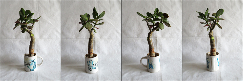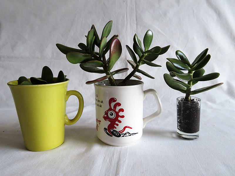 Below is one of my other jade plants in a small novelty coffee cup. This one is top heavy and has gone slightly off balance - it needs a coin wedge to keep it standing upright.
