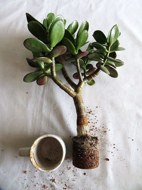 Although this jade plant has been in the same cup for about seven years, I would recommend that you clean the roots every three or four years if you intend to keep one of these.