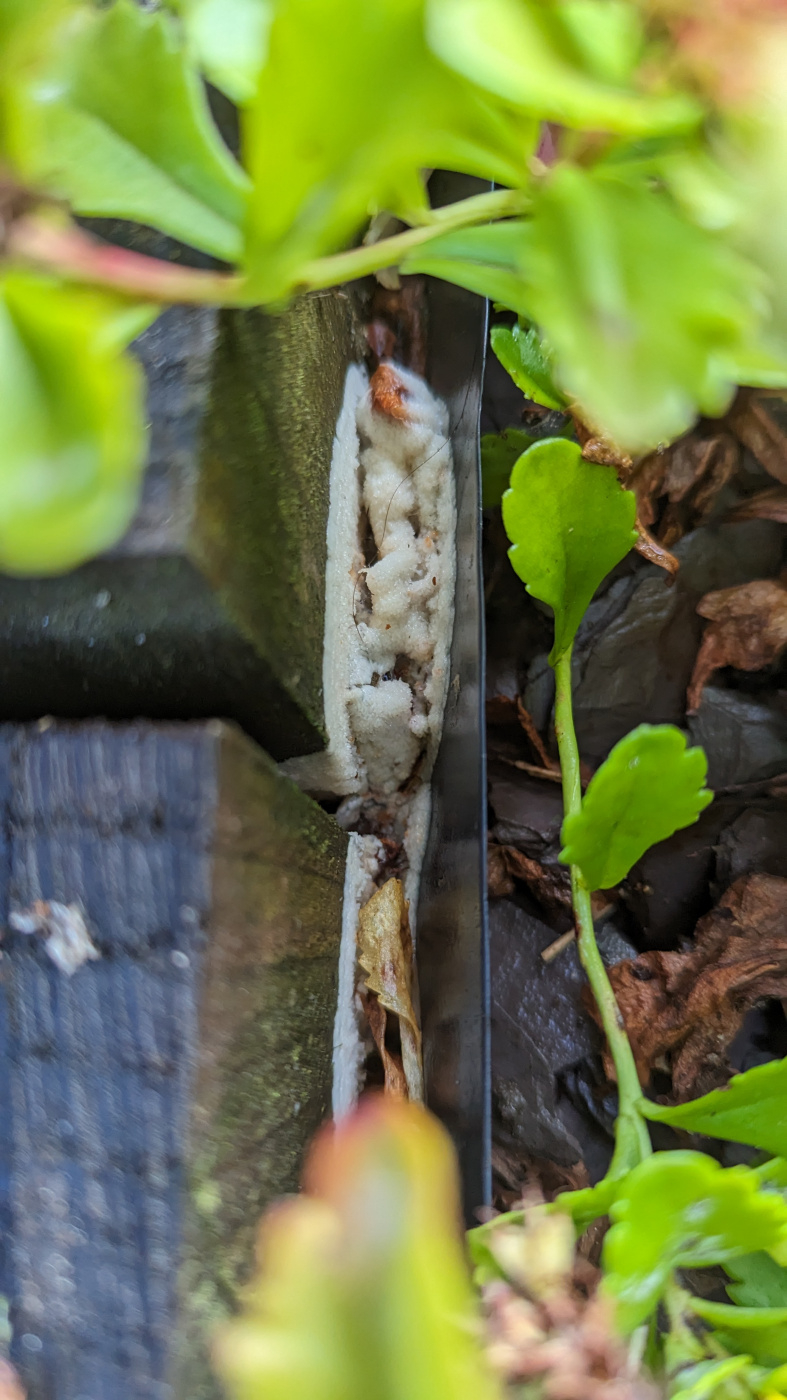 For several months now we've had this small pile of what looks like sawdust coming out of one of the gaps in a low sleeper wall. I'd always assumed an insect was to blame, despite never seeing anything in that area, but on closer inspection there is what appears to be white mould/fungus on the opposite side of the sleeper, which can't be a coincidence.