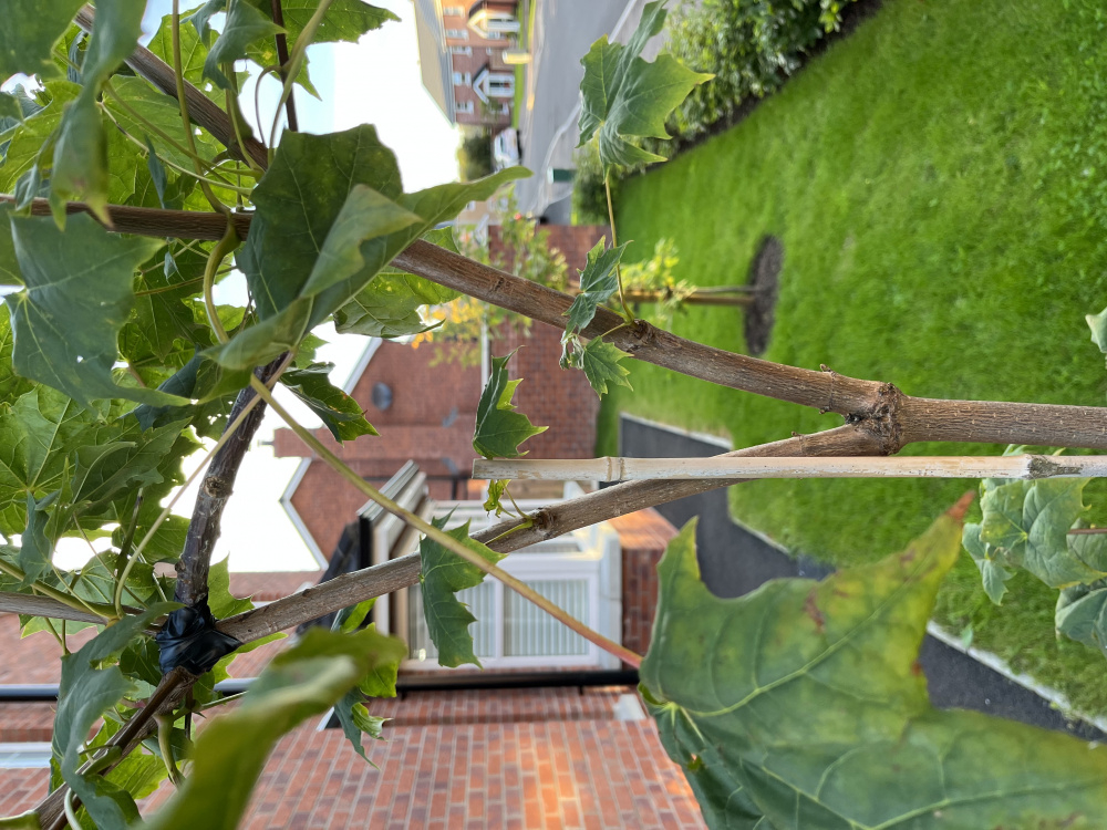 I'd take that cane away and fasten the stake properly to the trunk too. They get big and heavy quite quickly. They also get quite large, so I hope you have room for it to grow