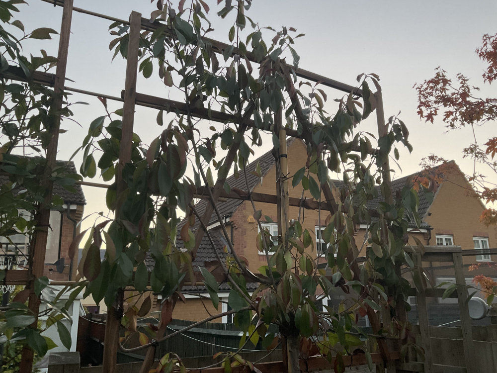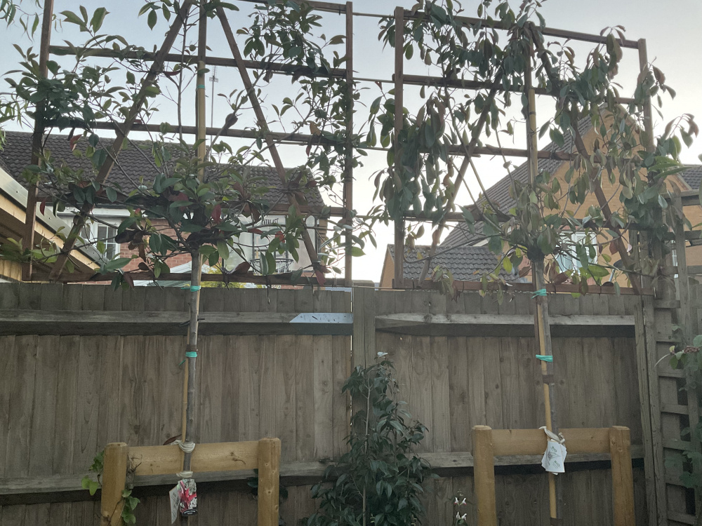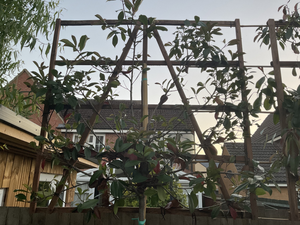I am not sure how successful growing Photinia in this way is they can act like a sail in a windy site. Also the leaves burn in a cold wind and defoliate, this has happened with a Photinia I have recently inherited in a new garden. The leaves have grown back but it is a poor specimen.