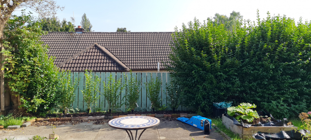 Hi, I need some.more new hedge advice. These are the hedges I planted in May. I'm about to cut back the big hedge beside them and wondering if I should be cutting back the new hedges as well to encourage more bushier side growth 🤔