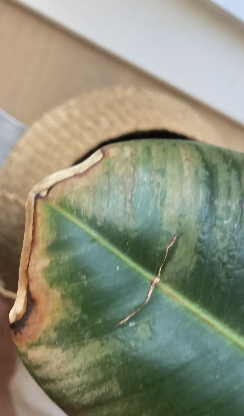 The edges of the leaves on our rubber plant are going yellow/brown. As you’ll see in the pictures, some of the leaves also have small brown spots on the edges. We were wondering if anyone has encountered this problem before.