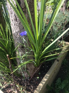 Its a cordyline and you can ease the side shoots off and repot and you will have replacement plants. You can then cut the dead plant down and replant in the same location if you wish after giving the soil a good feed and mulch.