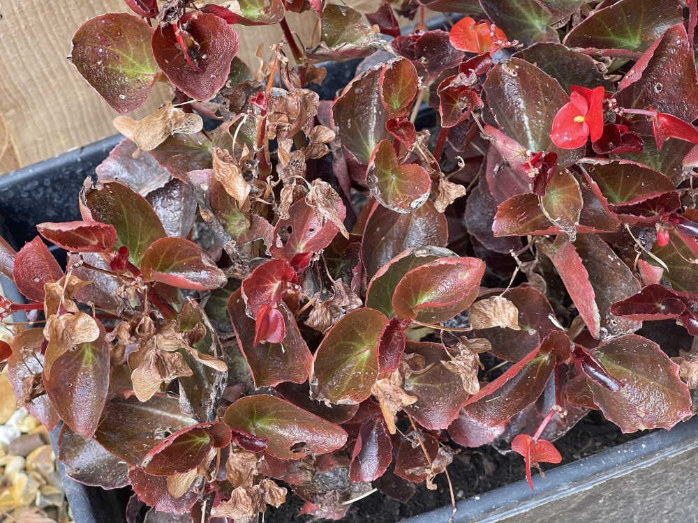 im not sure which way your garden faces but in the photo of the plants with the stone owl it looks to be in full sun. I think the plant in the middle is a Japanese Acer which requires a semi shady area. It looks as if it’s been “ burnt” by the sun and perhaps by circumstances it was dry at the roots. It looks like it needs a larger pot ( hard to see) and a shadier position, buds for next year showing though. Similarly the dark leaved plants either side in the troughs look to be begonia semperflorens ( sorry about spelling) they too like a semi shaded position. The dried bits look to be old flowers, I don’t know if they last over winter as I haven’t grown them for ages.