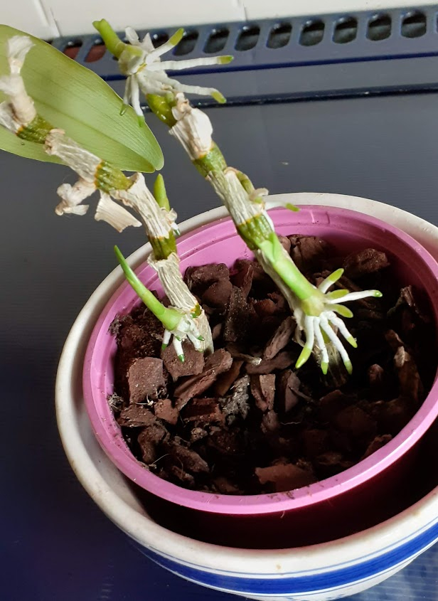 A friend gave me some roots/cuttings of a Bamboo Orchid, I potted these up in the correct compost, and after a long time these little shot/roots are appearing, not sure what to do, do I just leave them or does each shoot need potting up, would appreciate any help or advice.