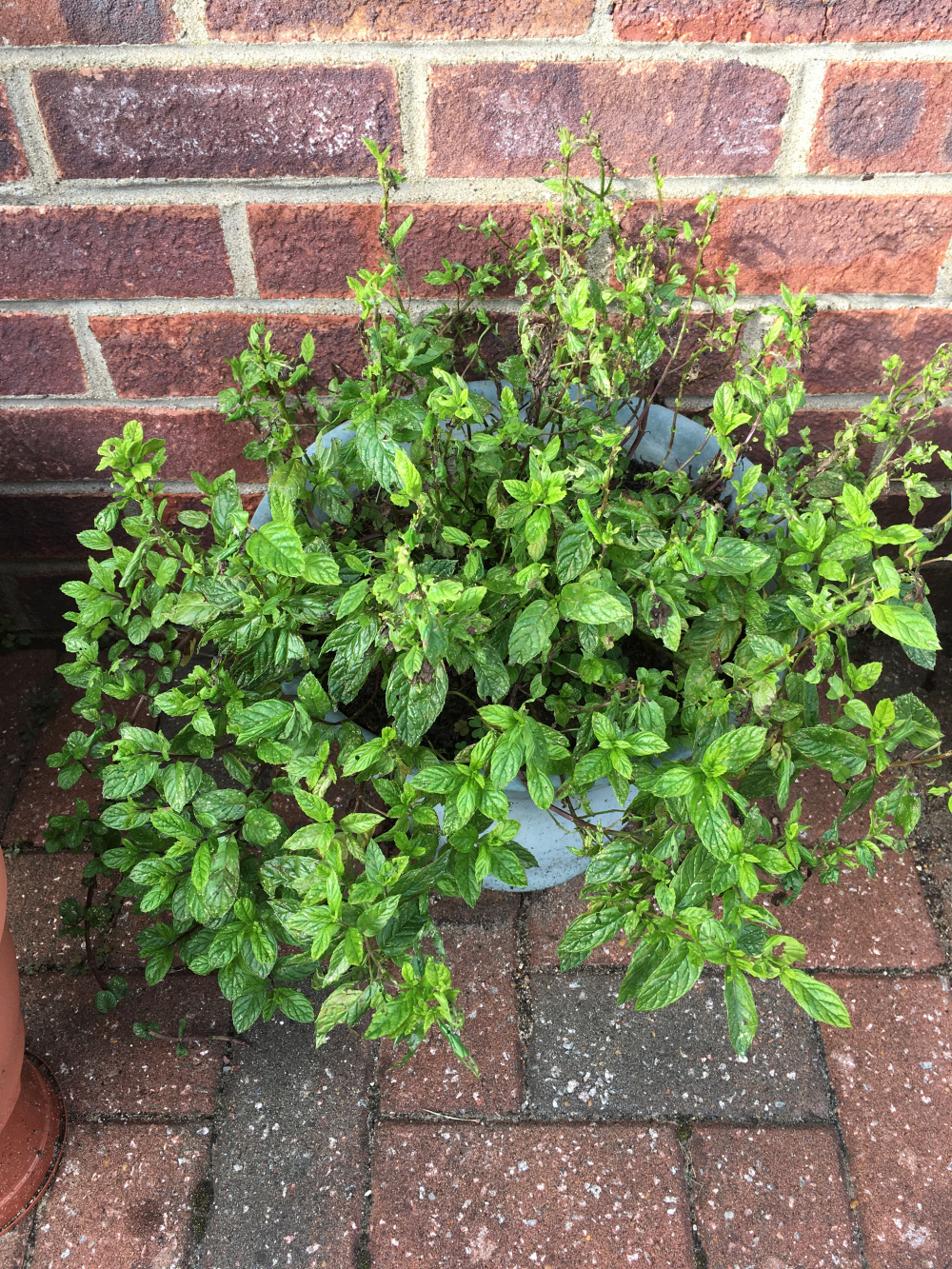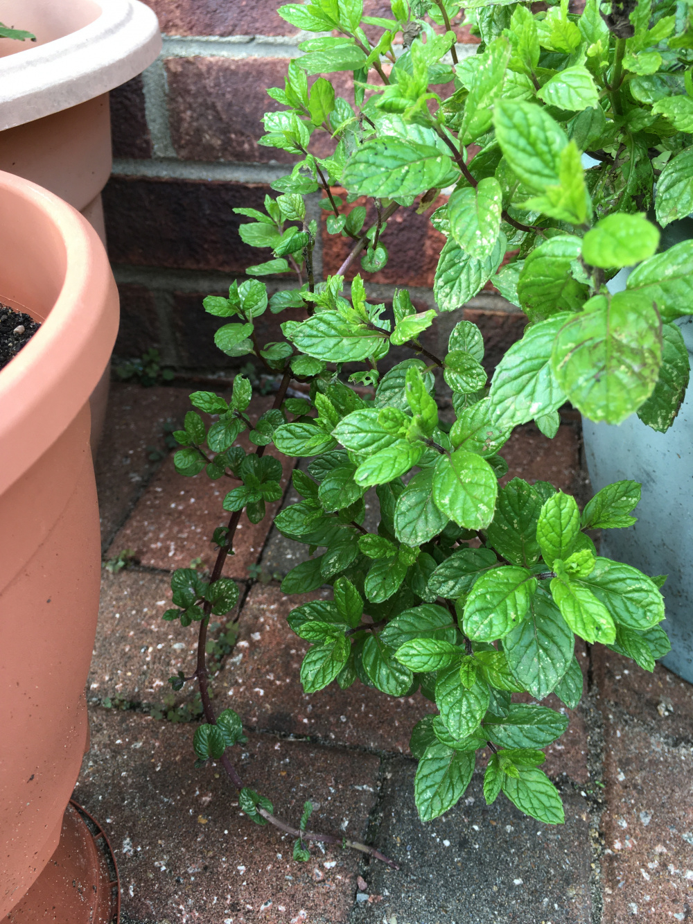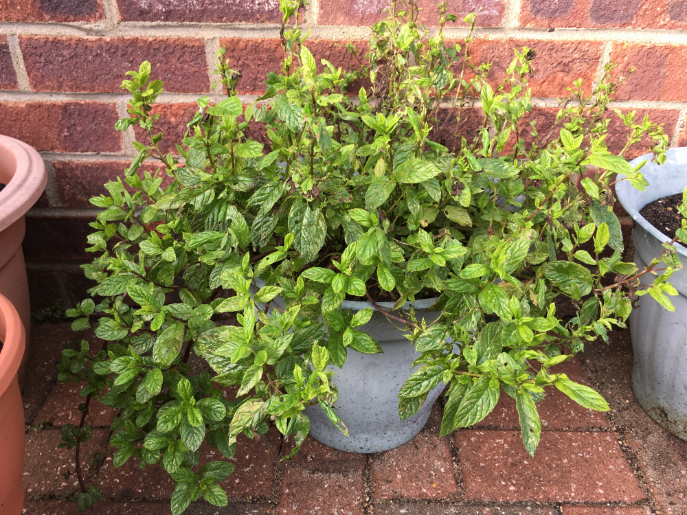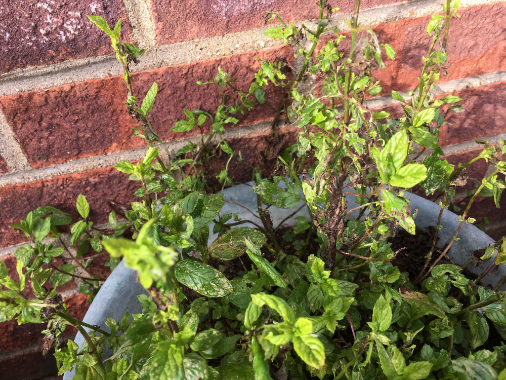 I have this mint plant which I planted into a pot a few months ago. It's in a very sunny spot (when it's sunny) outside next to a brick wall. It was looking healthy a few weeks ago, but now I can see a lot of leaves have gone brown. It is throwing out stems with leaves, trying to spread.