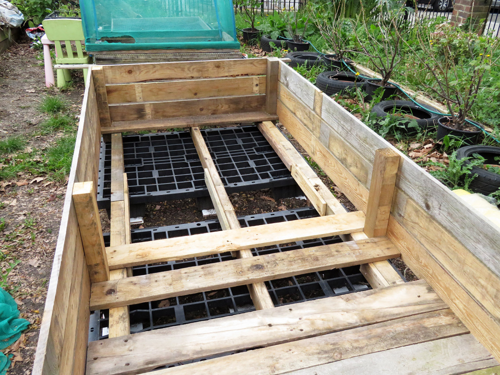 Slats were nailed to the base with up to 10mm gaps inbetween to allow for drainage. The three black plastic pallets were just for levelling off.