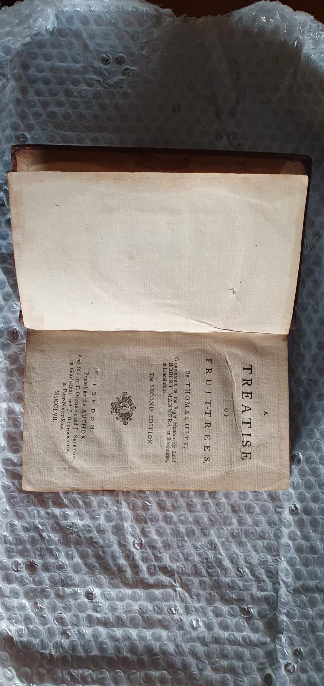 Interesting charity shop find, a copy of Thomas Hitt's Treatise of Fruit Trees, II edition, 1776. The provenance I believe includes the well-known Pomologist and Horticulturalist Sir Ronald Hatton (https://en.wikipedia.org/wiki/Ronald_Hatton)!