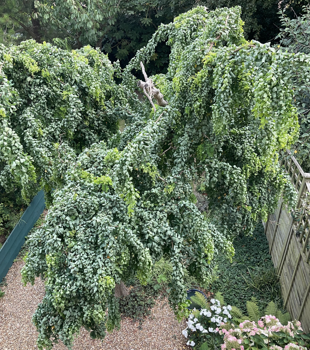 Two points to note. I have had lots of little suckers shoot off the rootstock, popping up all over. Maybe about 150! 😱 But these are easy to spot and snap off when a few inches tall. The other is all the bushy new growth has been attractive to pigeons, fancying it as a nesting site. I have had to stay vigilant to stop them getting started, as it is far too near the house for that sort of malarky. (I am not a fan of pigeons. Or squirrels. Or seagulls. 🤨)