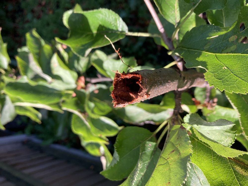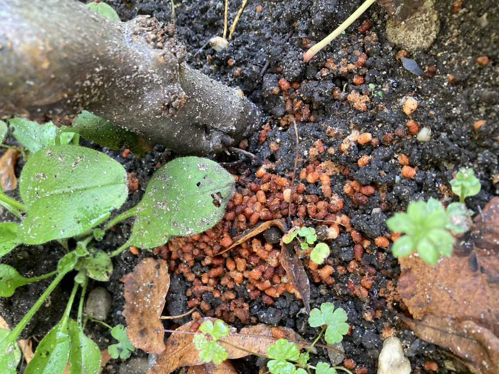 Can anyone help me identify what has caused the orange crumb like substance at the base of my apple tree? What ever it is has ‘eaten’ the young trunk and I’ve lost the top 3’ of the tree. 🙁