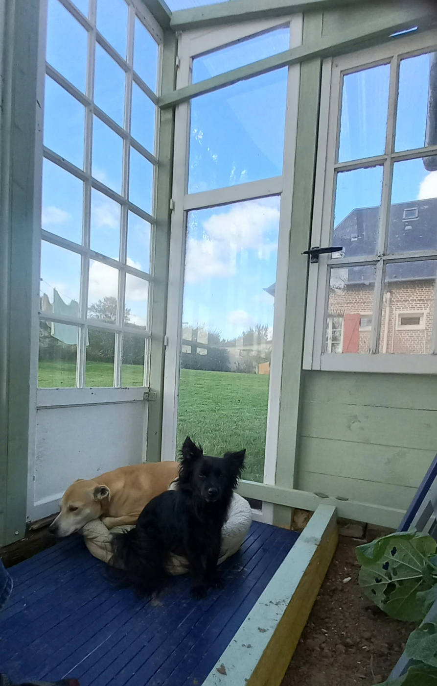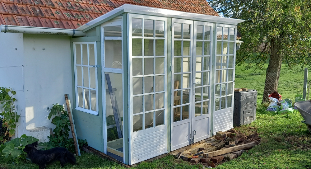 I have the soil to sift for the raised bed that goes along the back wall, a shelf to put up, the paving in front of the doors, and the minor job of creating a bed around the outside. Oh, and then some seedlings growing appreciatively next spring.