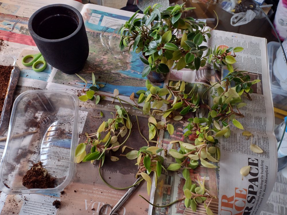 I took more than 50% off the plant because a lot of yellow leaves dropped and it was a good opportunity to cut below yellow leaves so they grow back without them. The plant was heavily flowering, as I had previously chopped it back a month or two ago. Unfortunately it has less soil in the pot though now. Now I have a ton of cuttings to propagate!