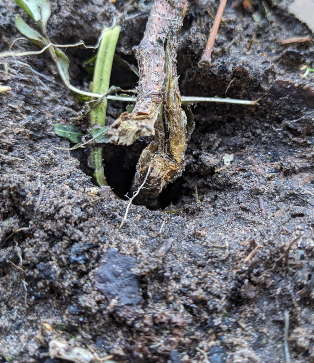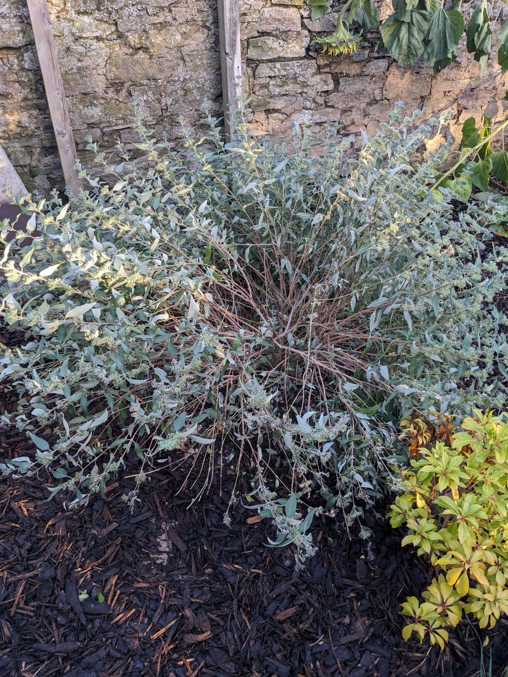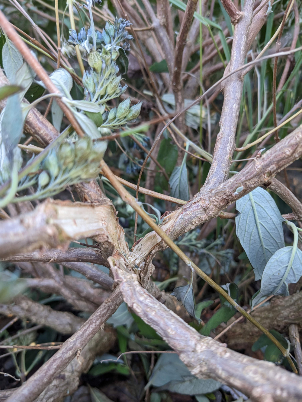 We thankfully escaped the storm mostly unscathed other than the garden gate being blown off and the damaged plants you see below; a Caryopteris that has snapped and split (and ruined the lovely big dome it had) and a raspberry that has only been in the ground a couple of weeks that has also split right where it meets the ground.