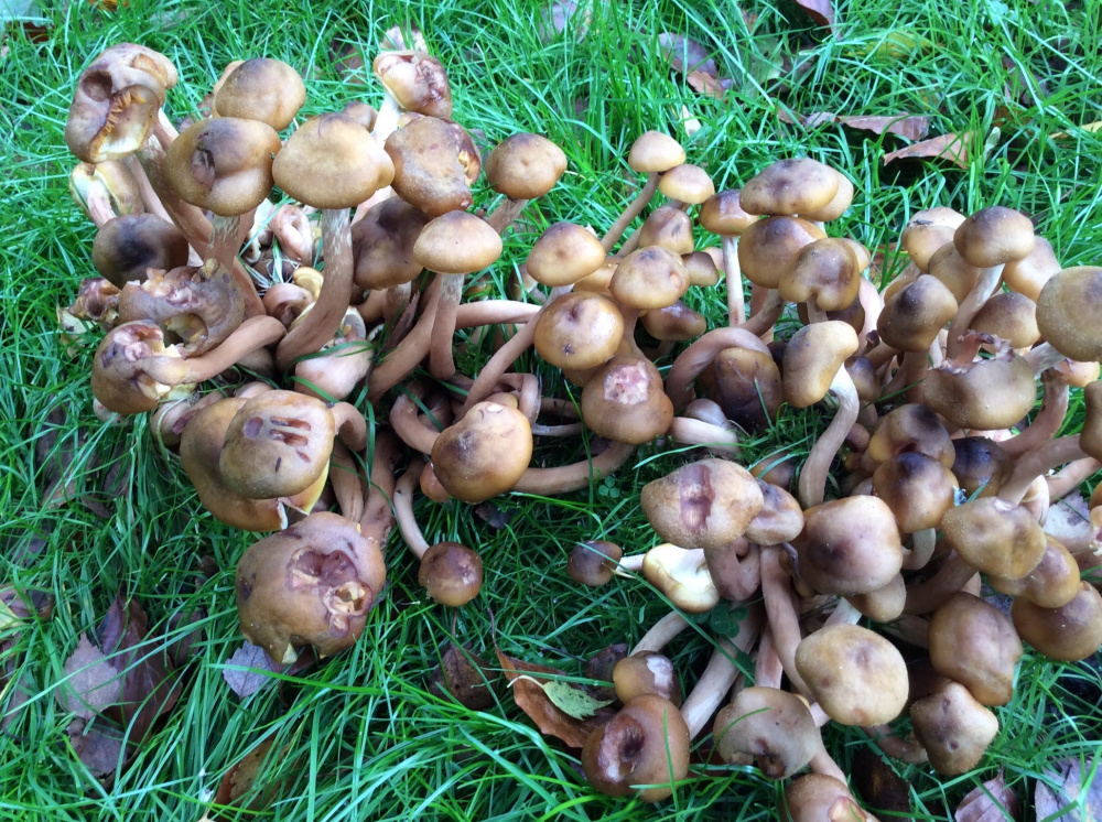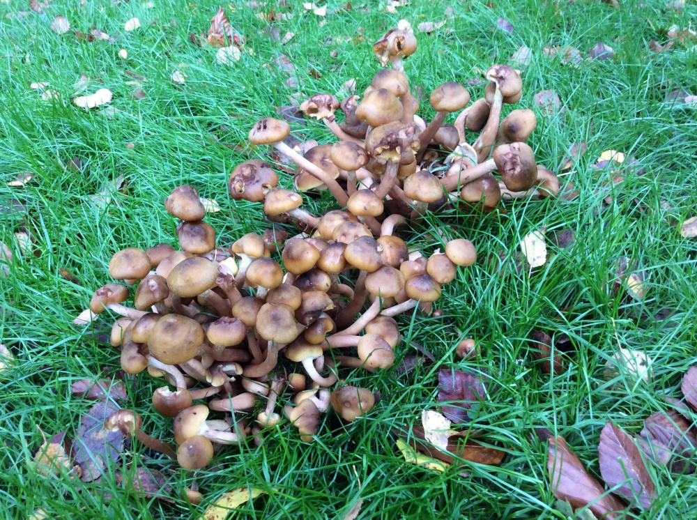 There is a row of clumps of fungi on the grass, leading away from a mature birch tree in the garden. Do these look like something sinister? I’m guessing that they might be following an underground root. Any ideas?