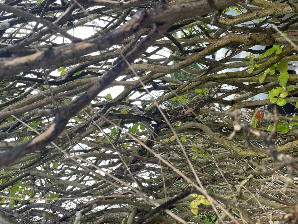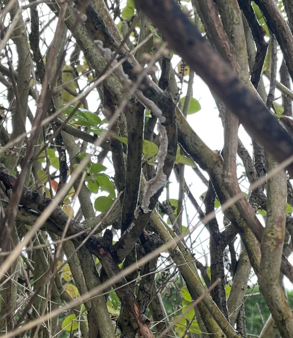 Hi, I moved into my house a year ago and not long after noticed the hedge on the front drive was dying in a particular place. The area has grown a lot over the year and I am wondering what the issue is and how can I reverse it. All help welcome! The stems look like they are coated in black but then I noticed today some white mould looking growth on some stems.