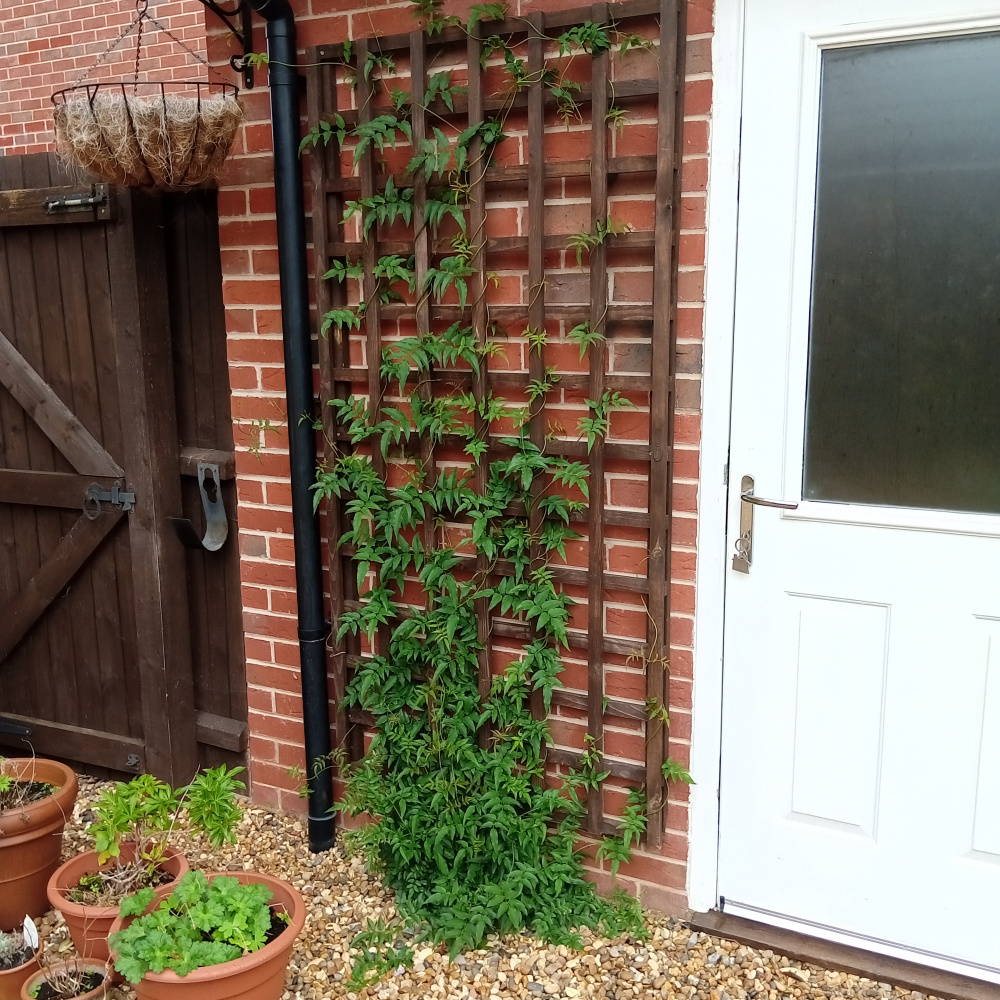 I have one jasmine in a large pot, and I have another planted in the ground (in a large pocket of soil under the gravel). Both have now climbed up their supports by 4 or 5 feet so plenty of exposed foliage.