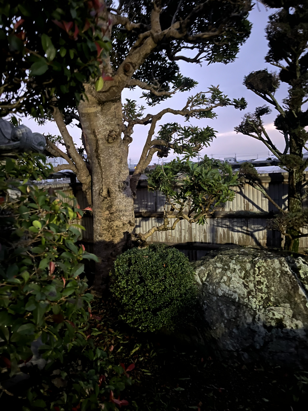 I did take a quick snap of the object at the bottom left. It is a low branch, I think. There is also a Japanese box holly at what looks like the base of the tree (but is actually a little forward of it).