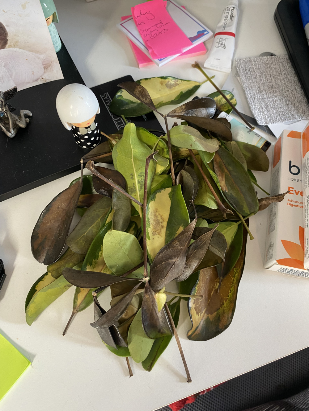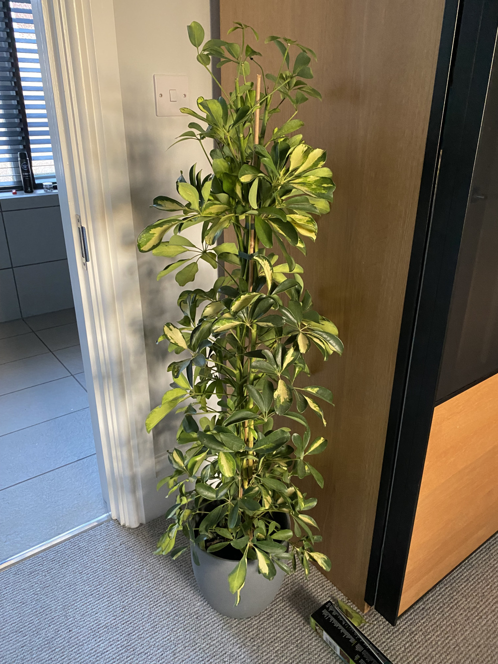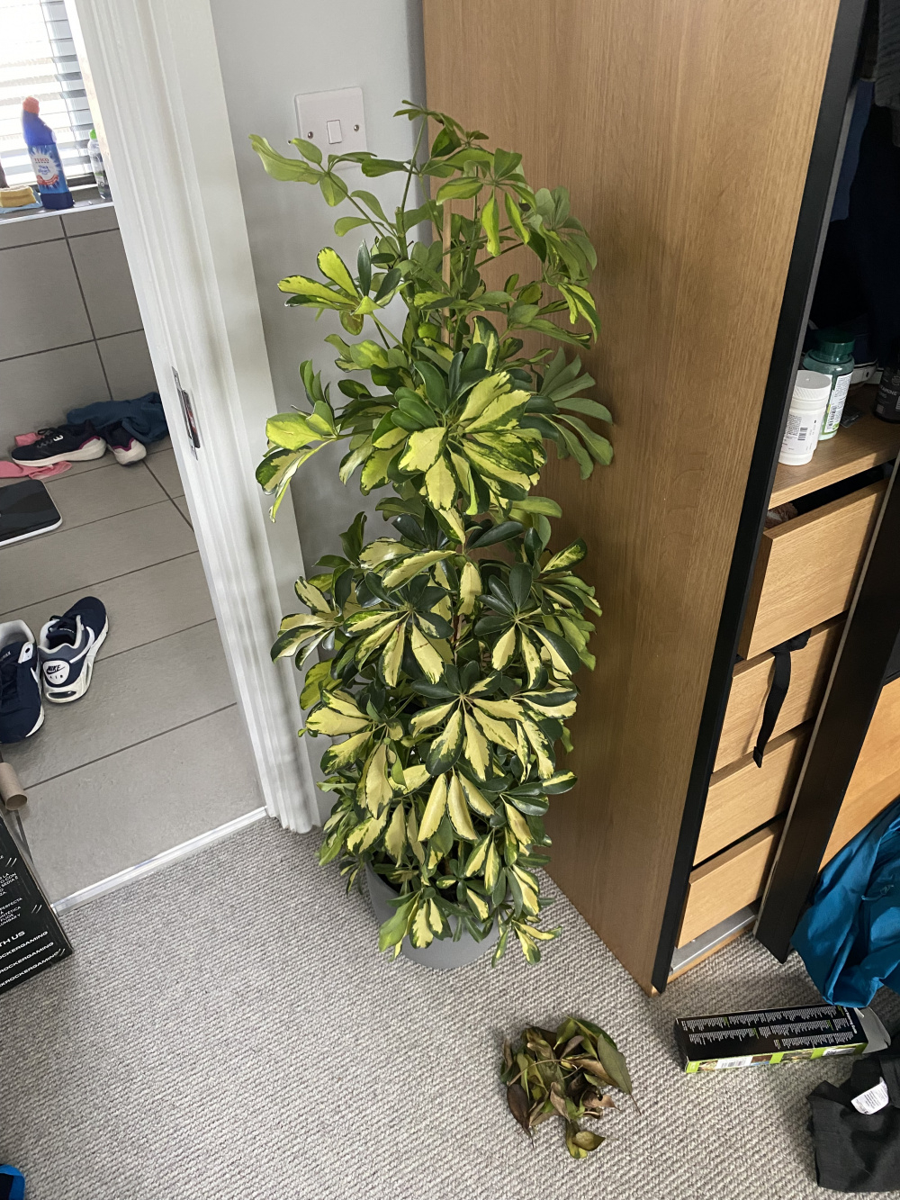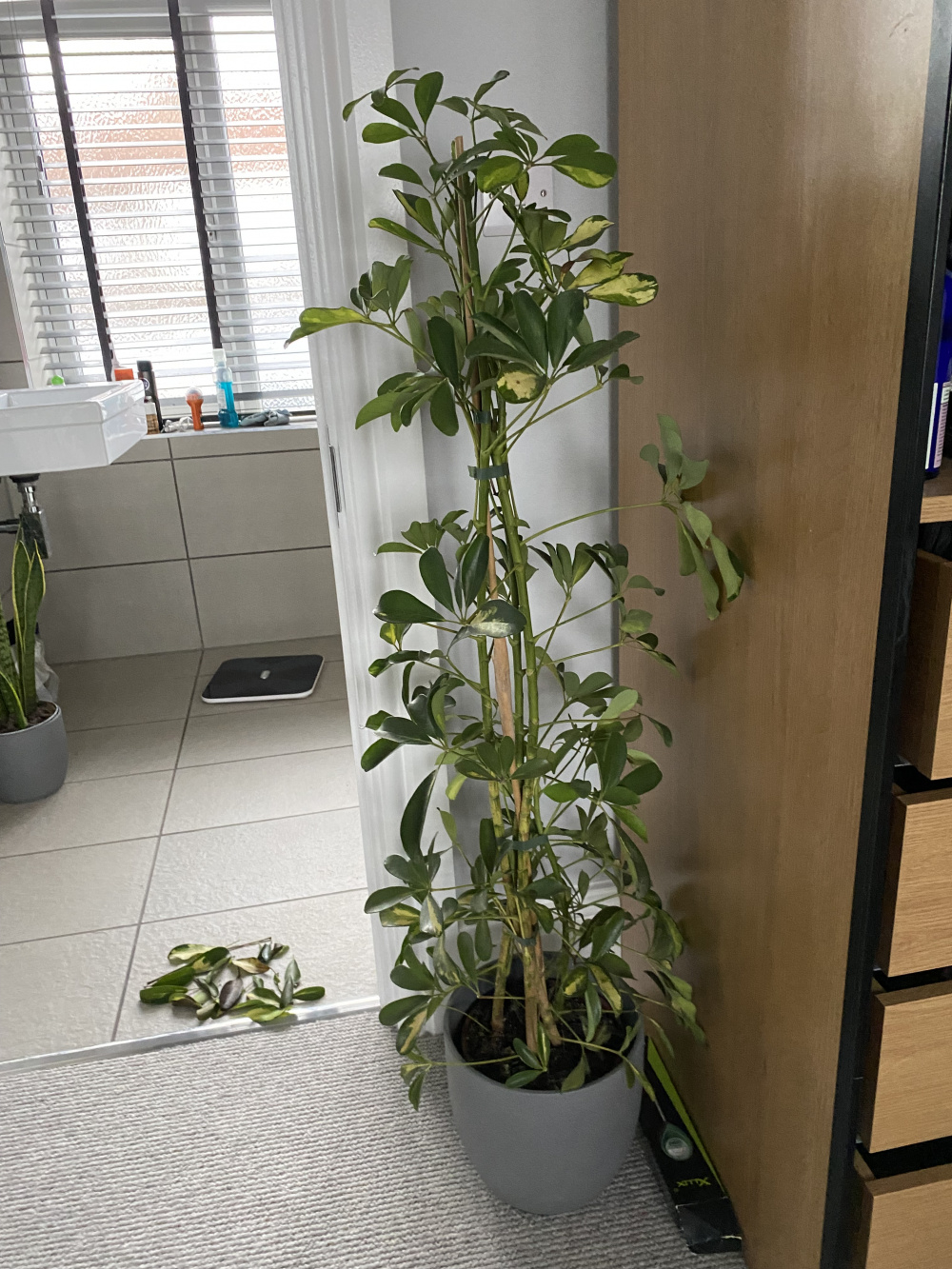Hi there! Desperate for some help. I bought a beautiful scheffler in mid September from a local plant shop. The plant began to leaf drop from the second I got it home. The leaf drop was so worrying that after a few weeks I went back to the shop and showed them pictures of the amount of leaves it had dropped. They reassured me that scheffler can be very emotional and can take a good month or so to settle down. The leaf drop has continued for the last 3 months and has not slowed. I am watering the plant on average every 2+ weeks and using the method where I place its pot in water for about an hour then pop it back in the big ceramic pot. I’ve been checking there’s no standing water etc. the plant is in my bedroom next to en suite where I shower every day so gets good humidity and the bedroom is south facing with a big double window so I think the plant is getting enough light (albeit it’s winter so not much light now) I am so sad to see this plant looking so poorly and have no idea what to do. Entire hess as ohhhhh branches and leaves drop daily as well as leaves that have brown spots or have completely browned. Help!!