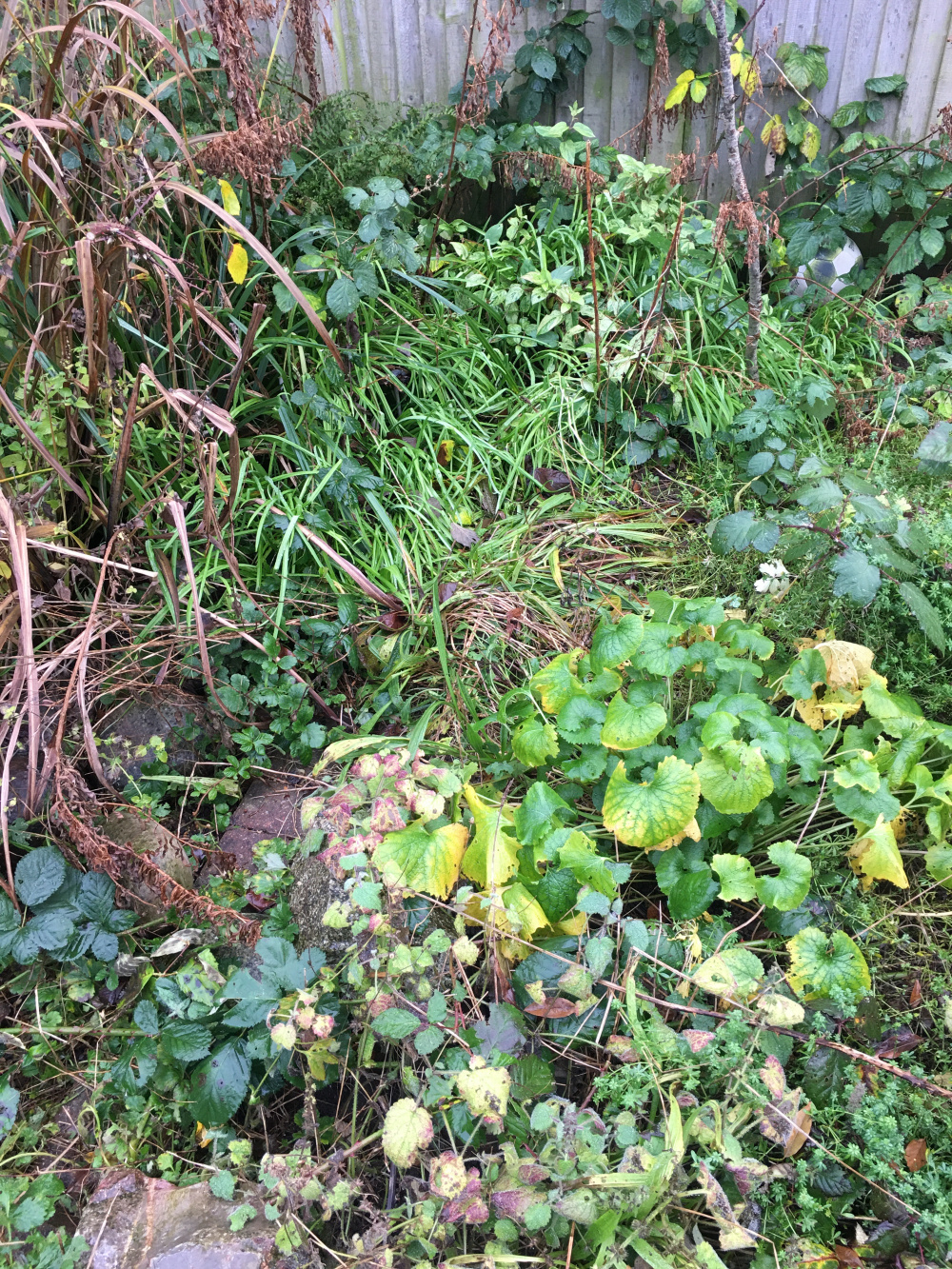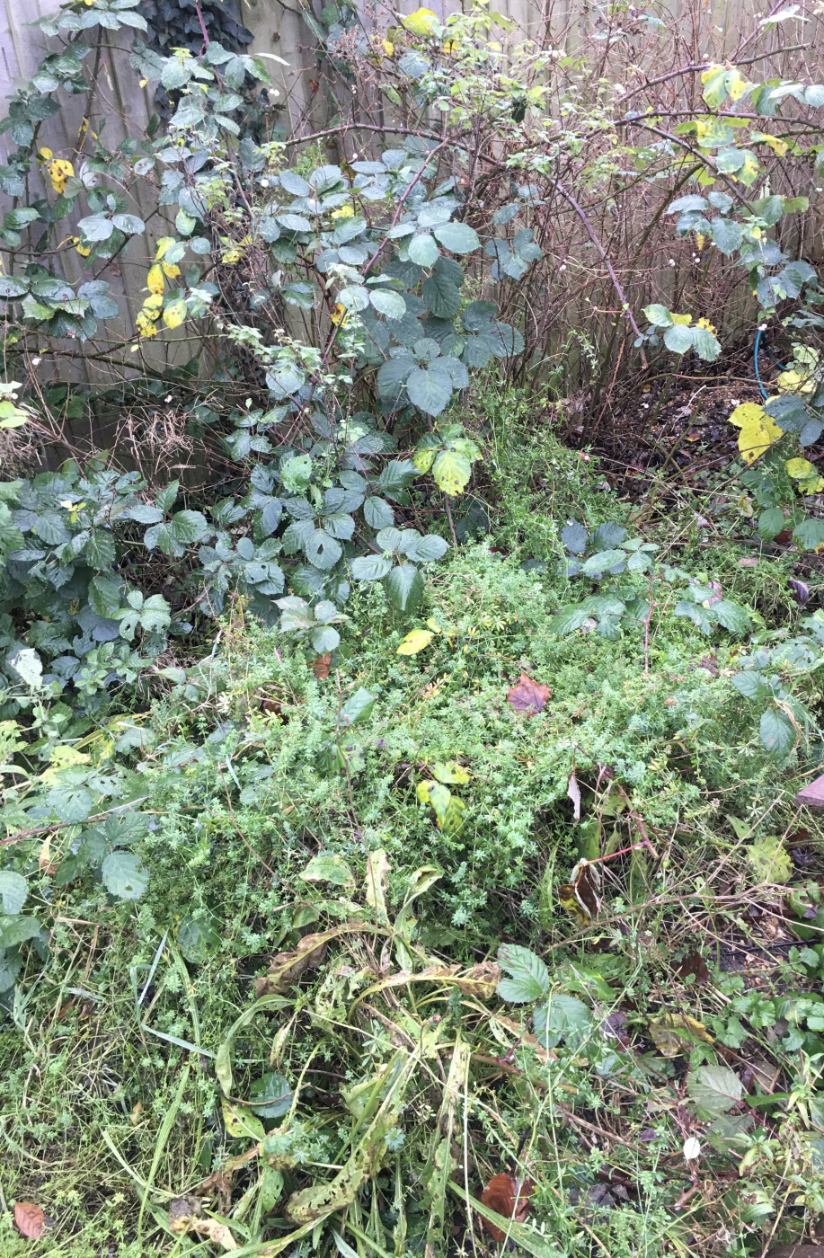 Unfortunately events (my parents’ deaths) has distracted me from gardening and the area is now a disaster zone. The world’s most vicious bramble has gone nuts (most of its roots are under the grumpy neighbours fence), and the area is thick with serious (very boring, no flowers, nothing) weeds and thistles (which are pretty for some of the time but not ideal). What to do!!?