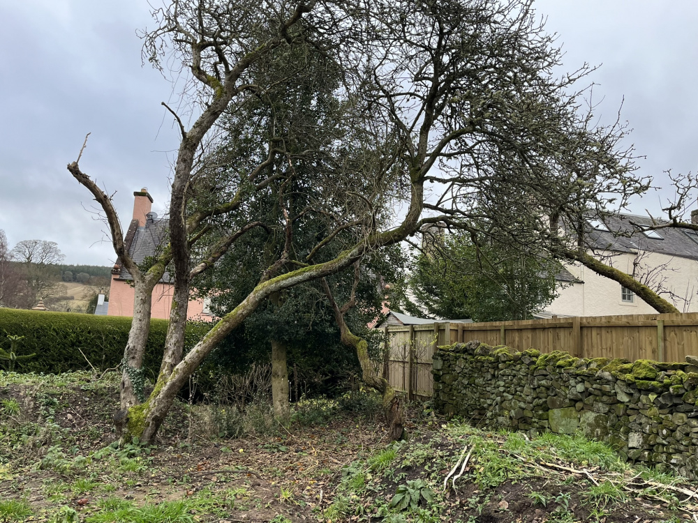 I have these 3 trees in a corner close to neighbours. The apple trees have had a hard life obviously, though both come into leaf and the larger one has apples. They have been ruined by Russian vine, you can still see some dead bits hanging.