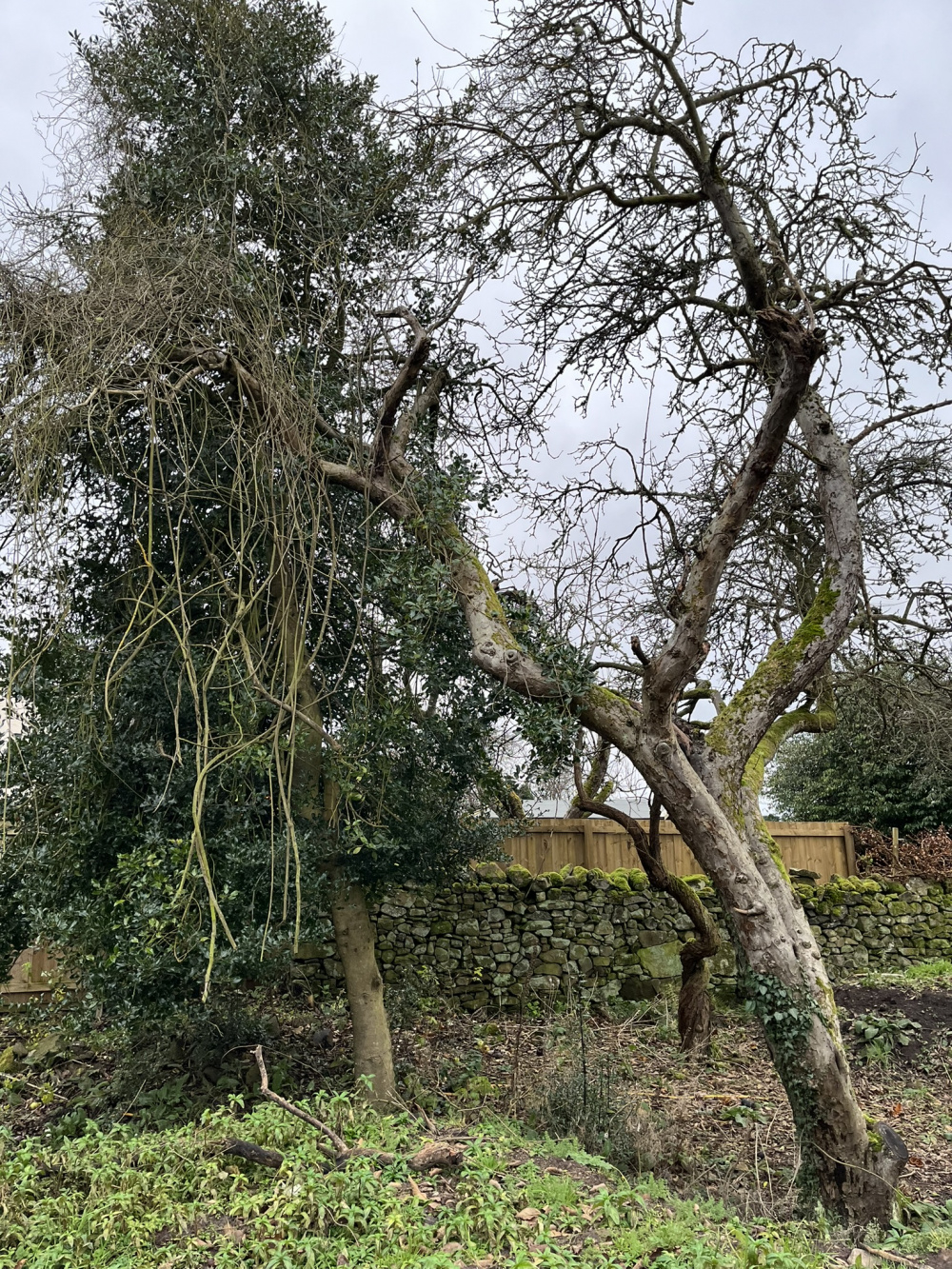 Scrappy trees. What would you do here? 2 apple trees and a holly.
