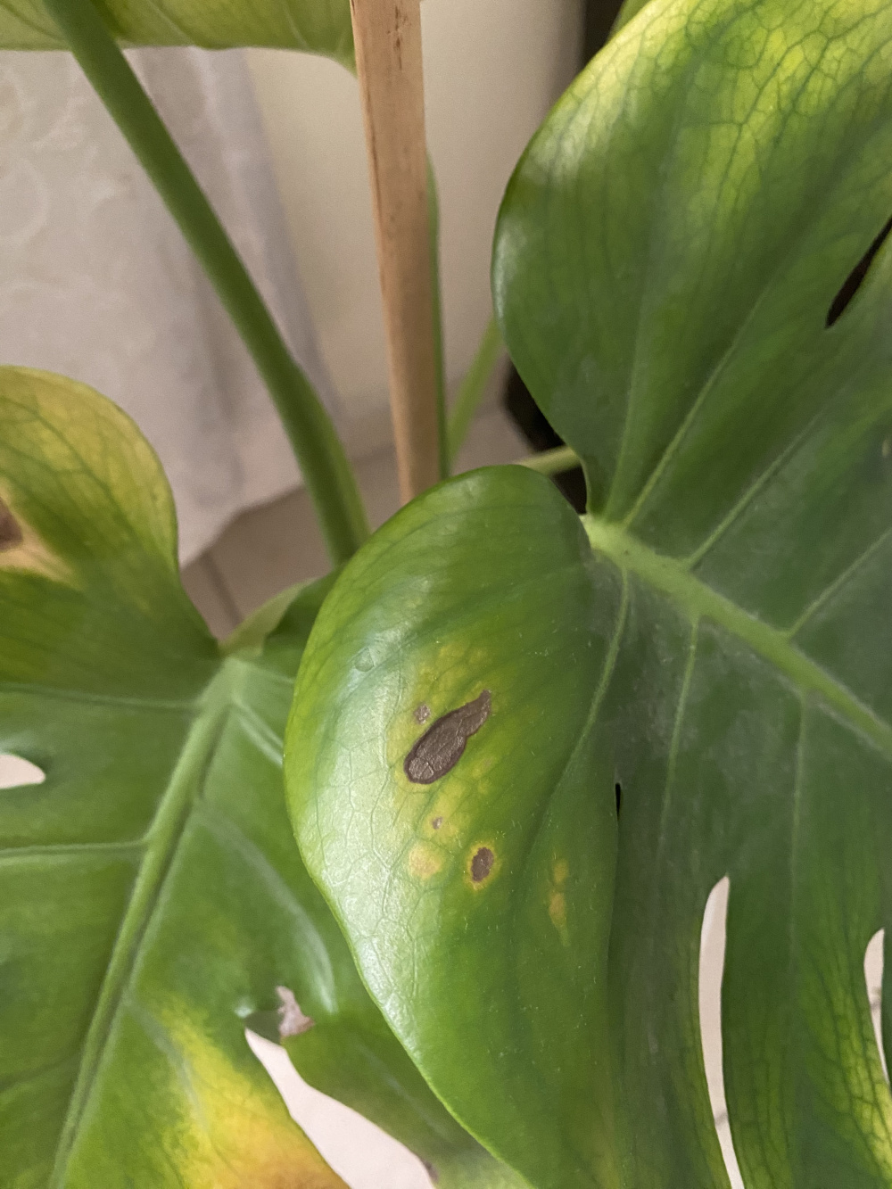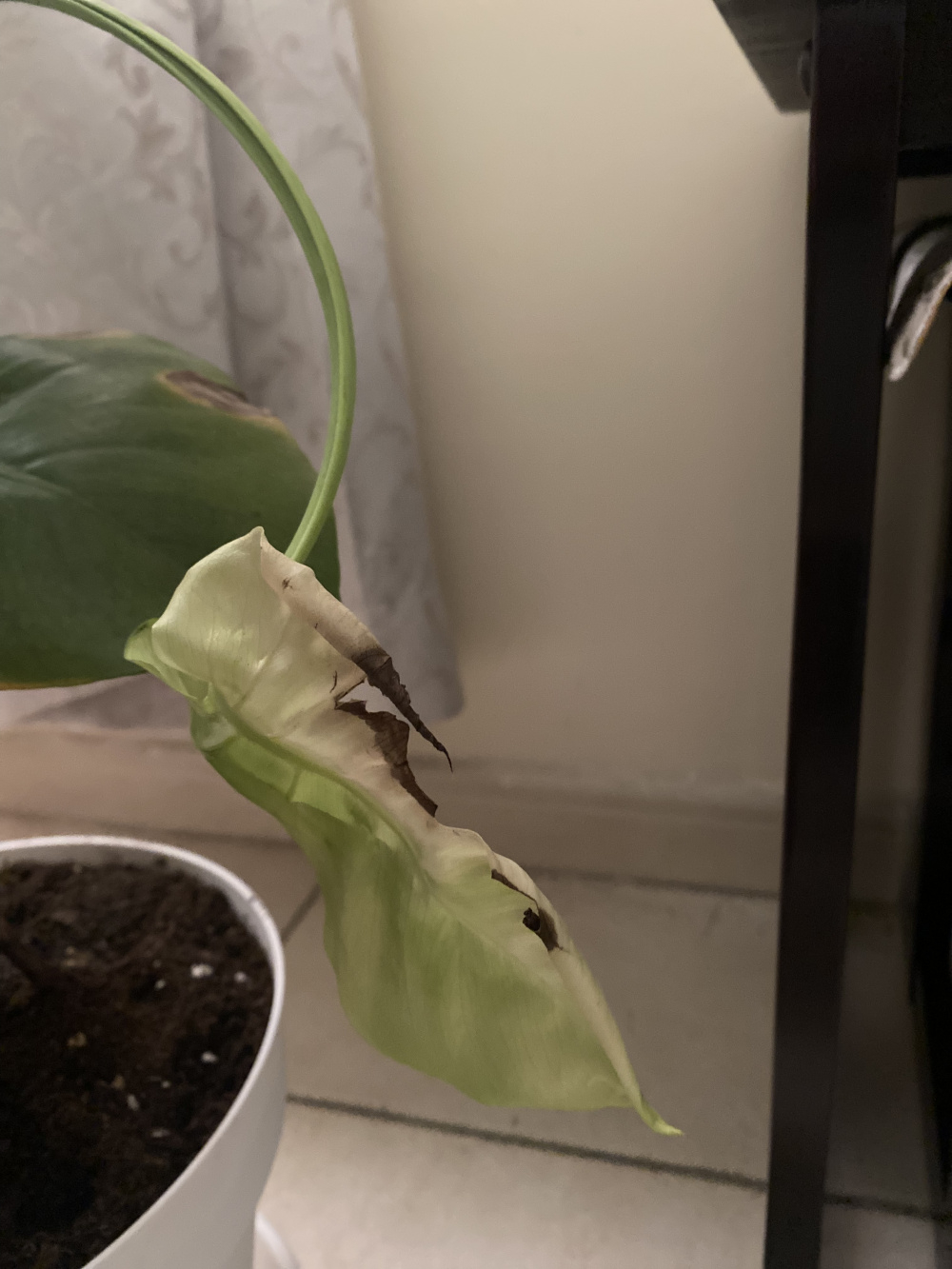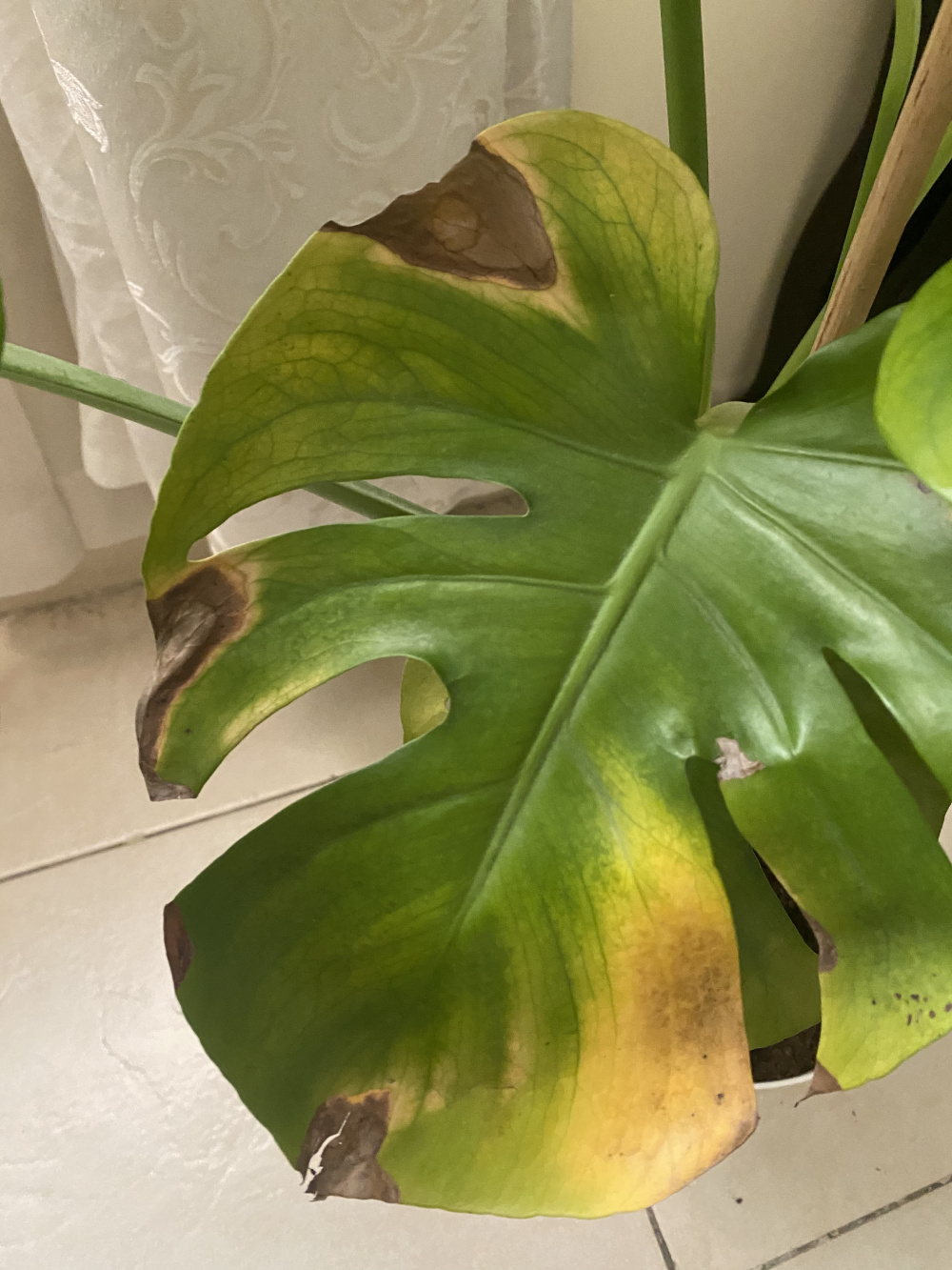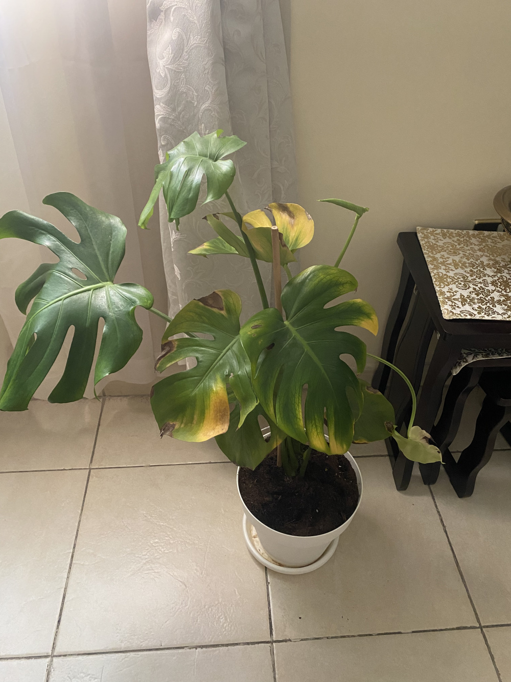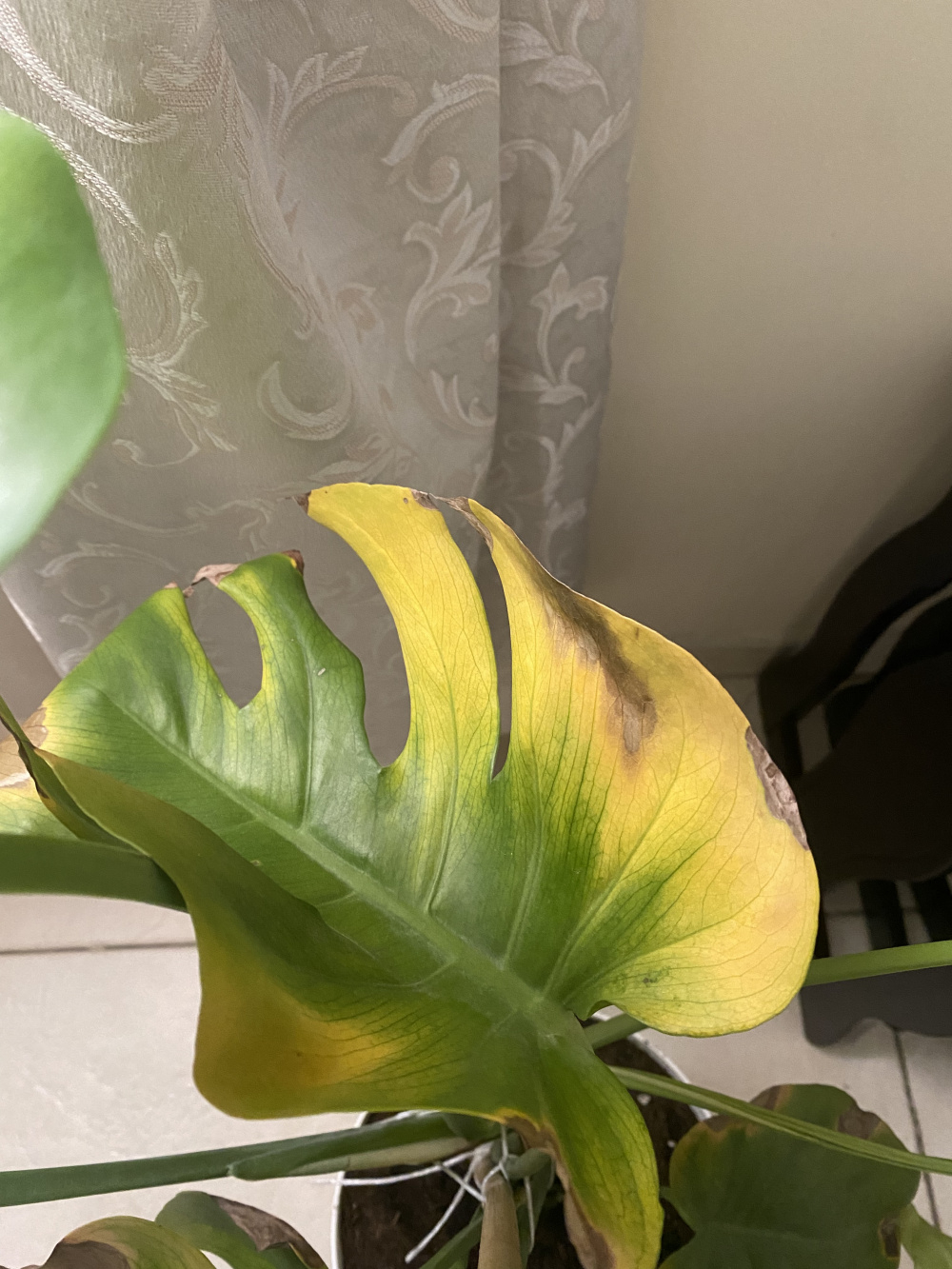 In terms of the Swiss Cheese plant, some leaves are yellowing on the outside and are turning brown and dry on some of these yellow parts. A new leaf has formed but it seems pale and a little wilty and has been engorged by brown on some of its tips. I read the yellowing can be due to overwatering and that the browning can be due to underwatering so I am a little conflicted.