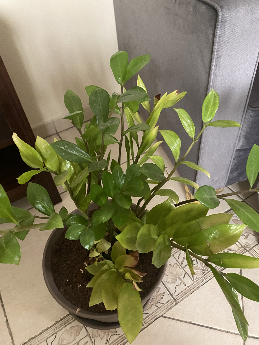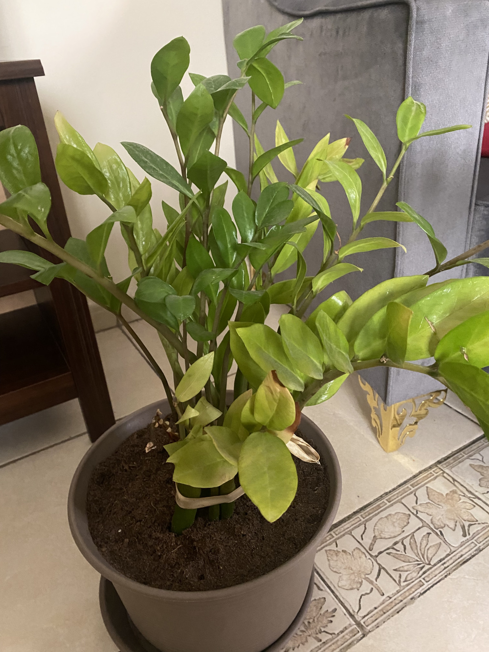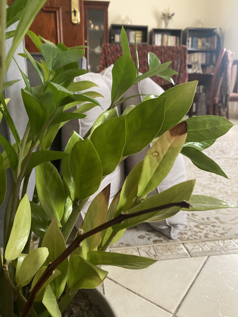 In terms of what I suspect is a ZZ plant, some leaves are paler compared to the rest with some going on to turn yellow. As you can see, there’s also a stem that looks healthy up to a point before it dries up, browns and shrivels to look like a twig. The stems also have to be tied as they keep falling over. I read all these symptoms can be chalked up to overwatering but we’re quite careful not to do that. The light is also quite moderate so i don’t think it could be a light issue. There also seems to be no pest issue with regards to any of the plants.