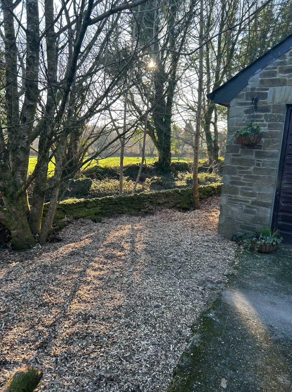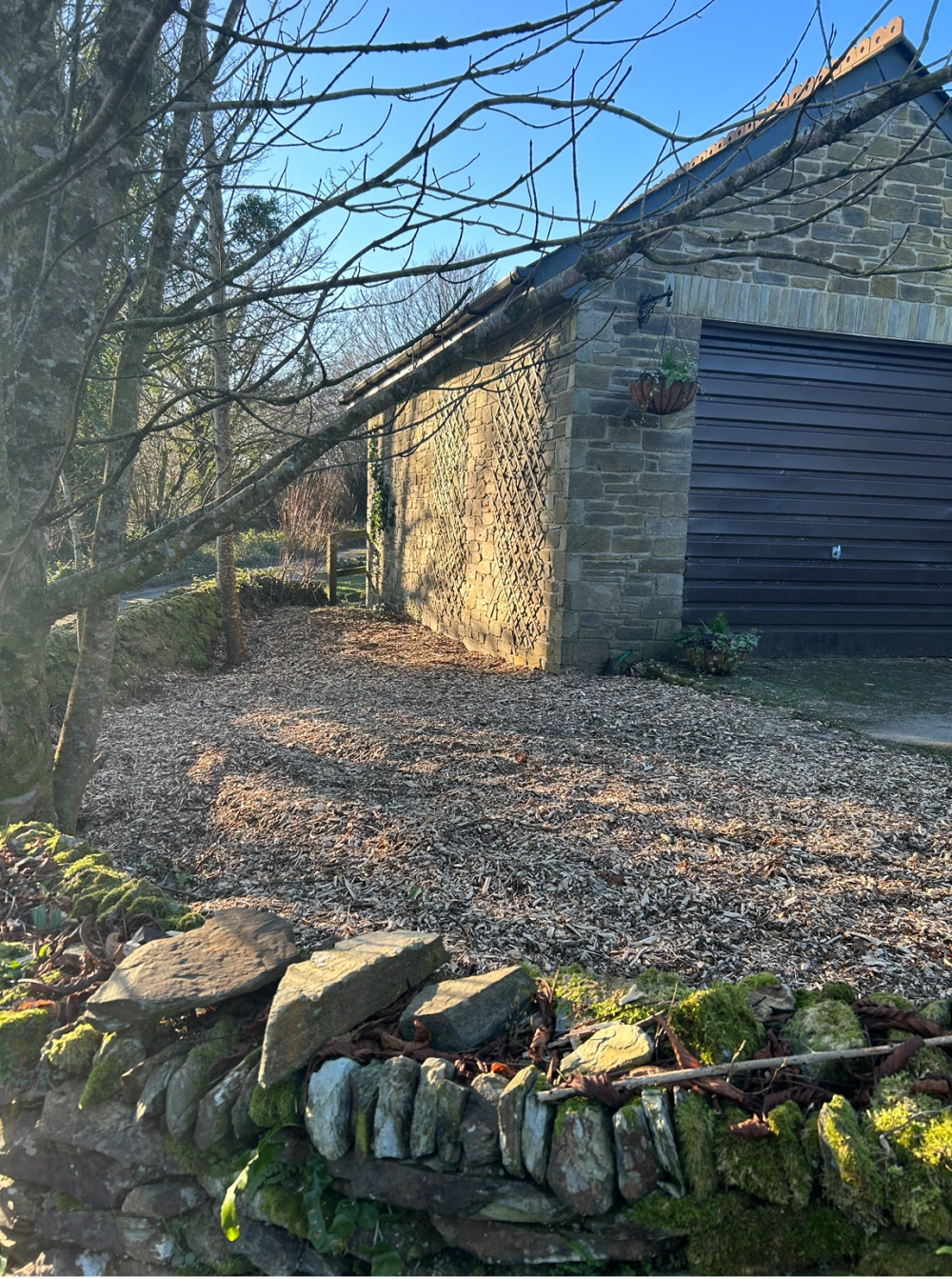 It's South facing and it's covered in wood chip as the tree we had cut down from another part of the garden, the tree surgeons put all the chips down here, what can I plant here to look nice? With the possible climbers? ANY advice welcome, I really do appreciate hearing from people who know about gardening! (I am slowly learning bits and pieces 😂)