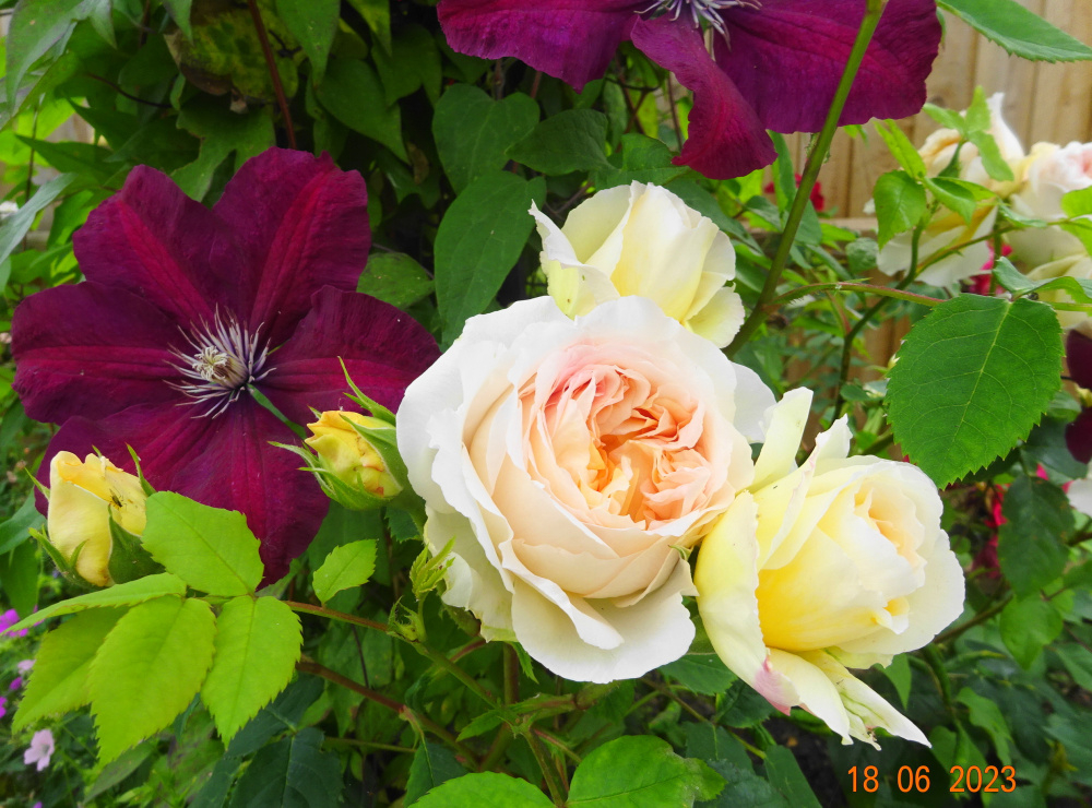 .. Clematis 'Niobe' again, it goes so well with apricot roses...