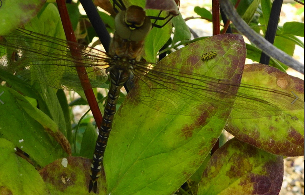 ..fearsome.. ..leaf cutter bee with a rose leaf.. .. I admire their synchronisation.. ..this one arrived last October.. ..a Damselfly just flew in and took shelter on a very hot day in the 90's.. a baby Ladybird to the right..