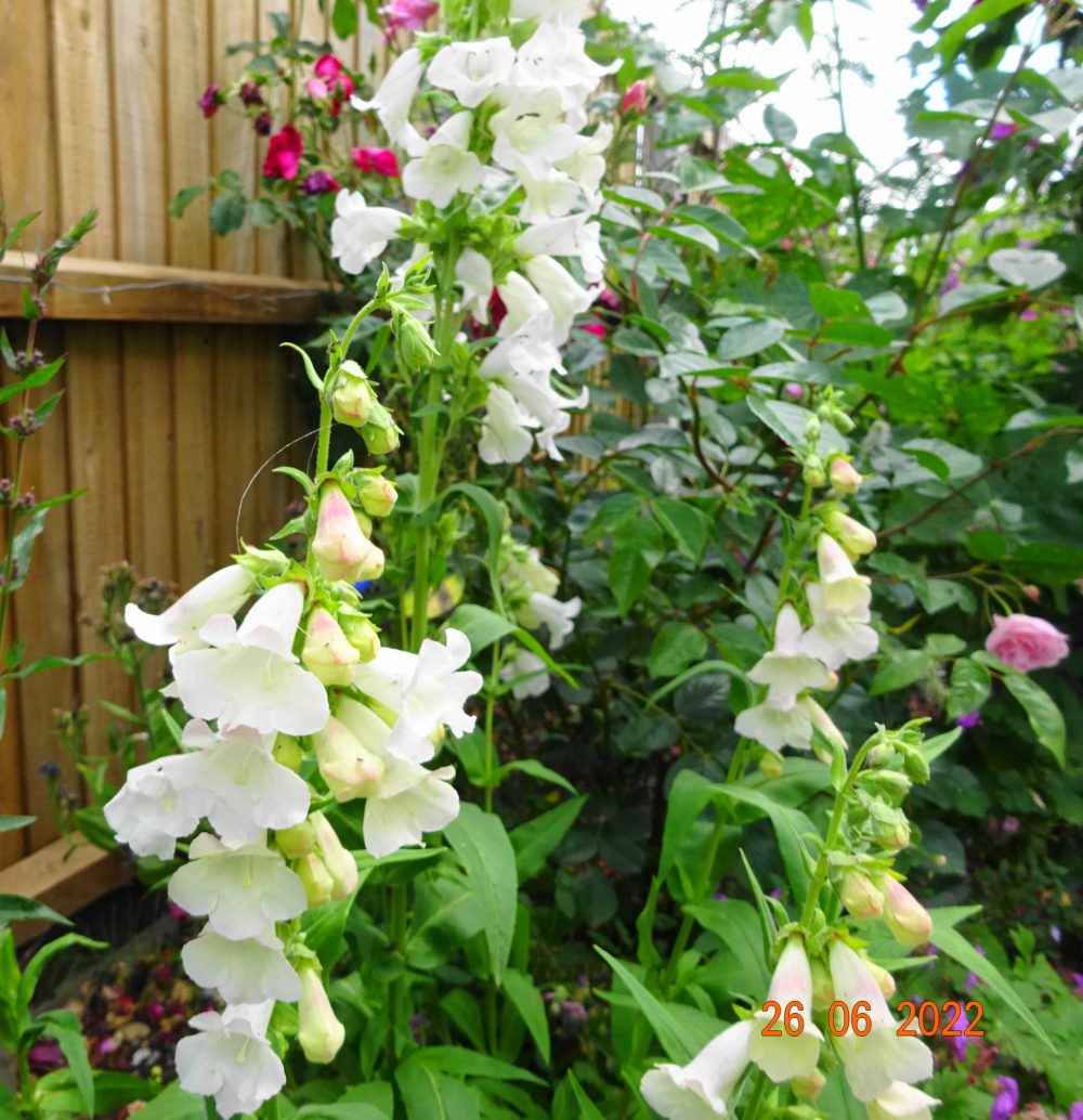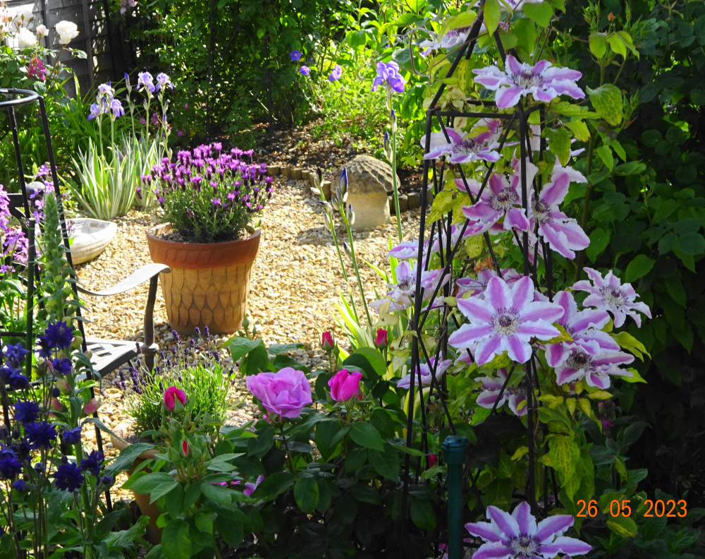 Clematis 'Souvenir du Capitaine Thuilleaux'.. ..a poignant history, and flowers of such exquisite beauty, with its old fashioned murrey purple bandings.. mostly Spring with some later flowers.. never takes over and suitable for a shady corner.. Geranium 'Patricia'.. a fabulous plant, flowers all summer. I find that it's best in a shadier, moist site and just left alone without cutting back midsummer.. I also have it in sun too.. ..lovely with pink roses.. Hemerocallis 'Claudine'.. a sumptuous, dazzling red with yellow throat.. ..flowers from 29th June - 20th August.. ..simple Chives, rather weedy but so useful.. here with Brunnera 'Jack Frost', I love the emerging buds.. ..long flowering, cut back at midsummer for repeat.. Penstemon arabesque 'Violet'.. this appears to have overwintered so far.. good deep colour.. Phlox 'Mt. Fuji'.. strongly scented and always puts on a good show, very reliable and trouble free.. I also have Phlox 'David' but I can't tell the difference..
