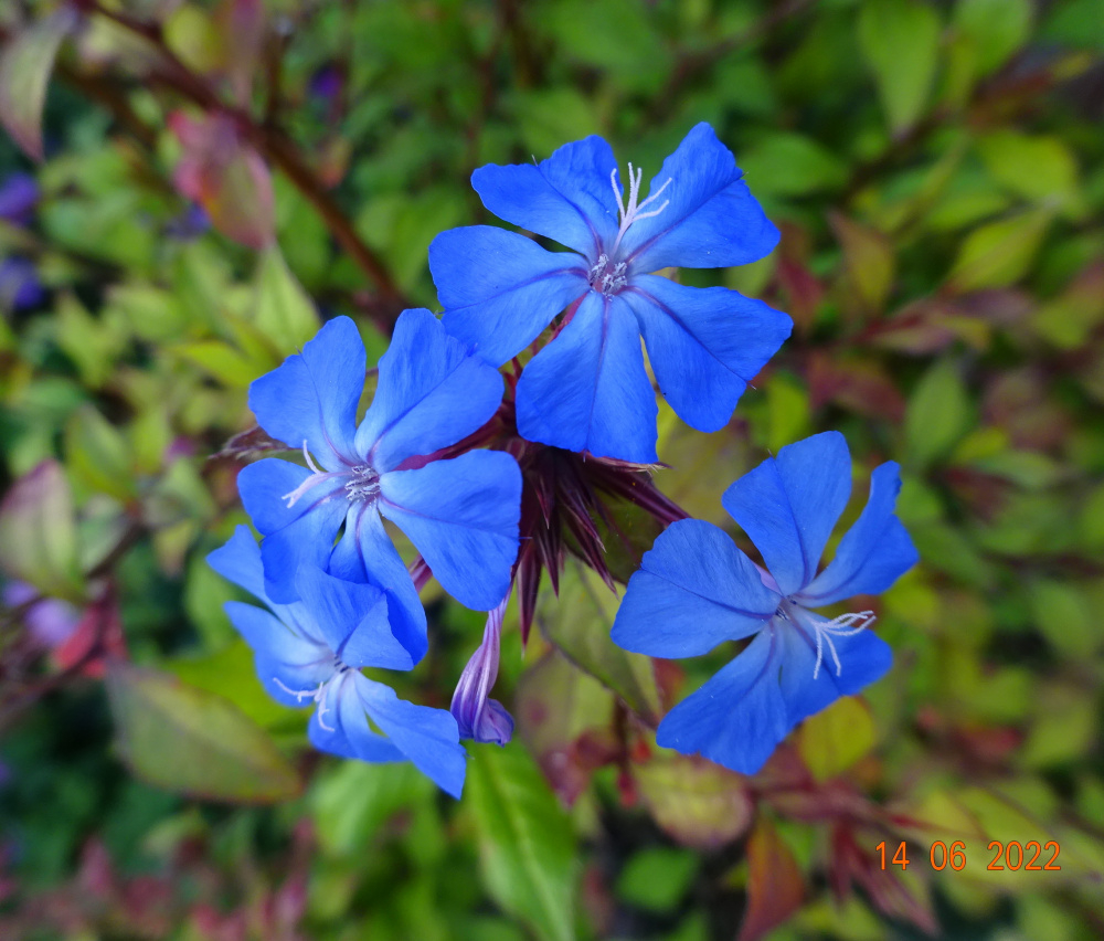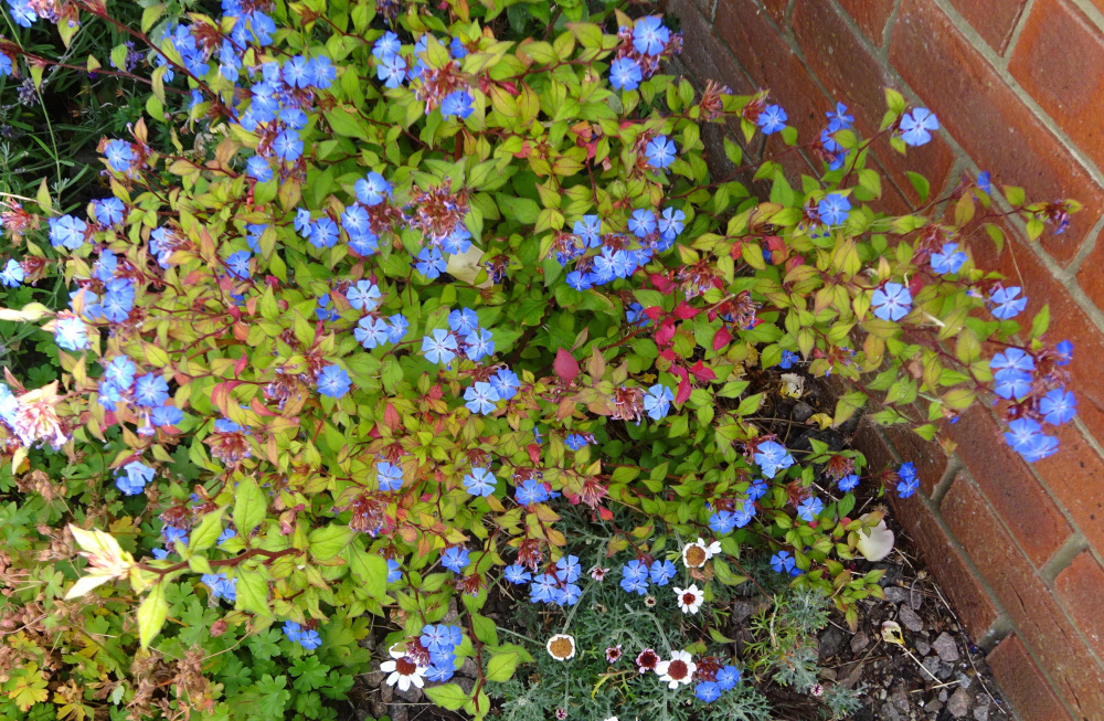 Ceratostigma willmottianum.. hardy Plumbago.. love this cobalt blue, I have about 5 of these small shrubs, for hot dry places, but I have found it also does well in well drained but moist shadier sites, surprisingly. No hardiness issues here through many winters..