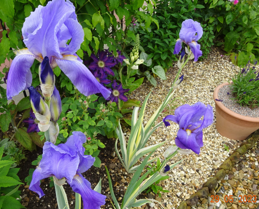 Iris pallida 'Variegata' is similar except the leaves are more yellow/green.. equally long lasting foliage.. and flowers that are a little better than the above..