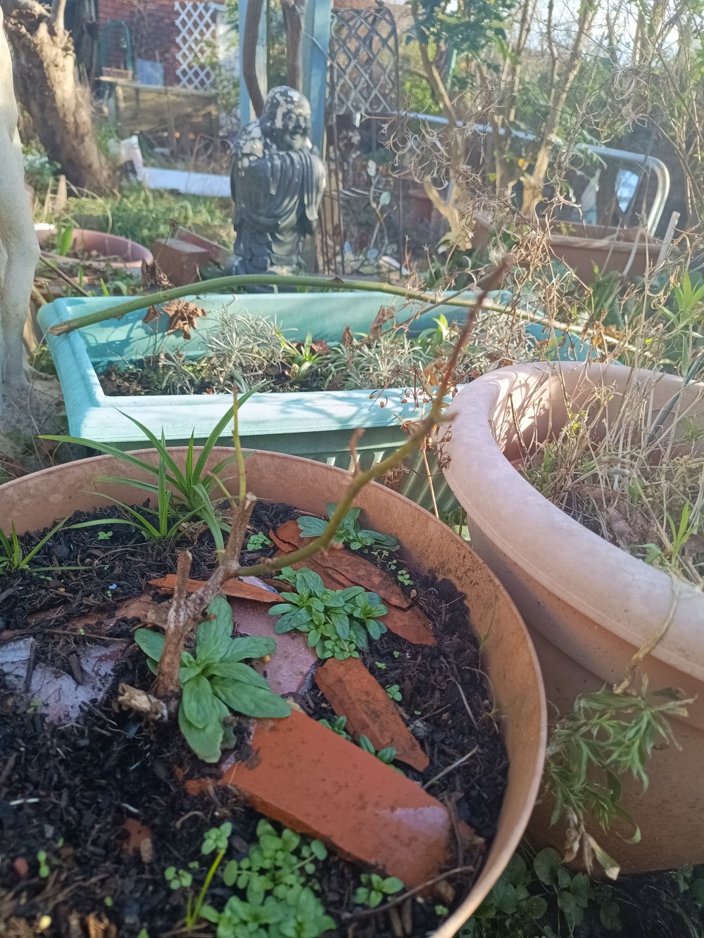 Weed all the pots and then when you've pruned, apply a good mulch of bagged manure around the roses, but NOT touching any stems.