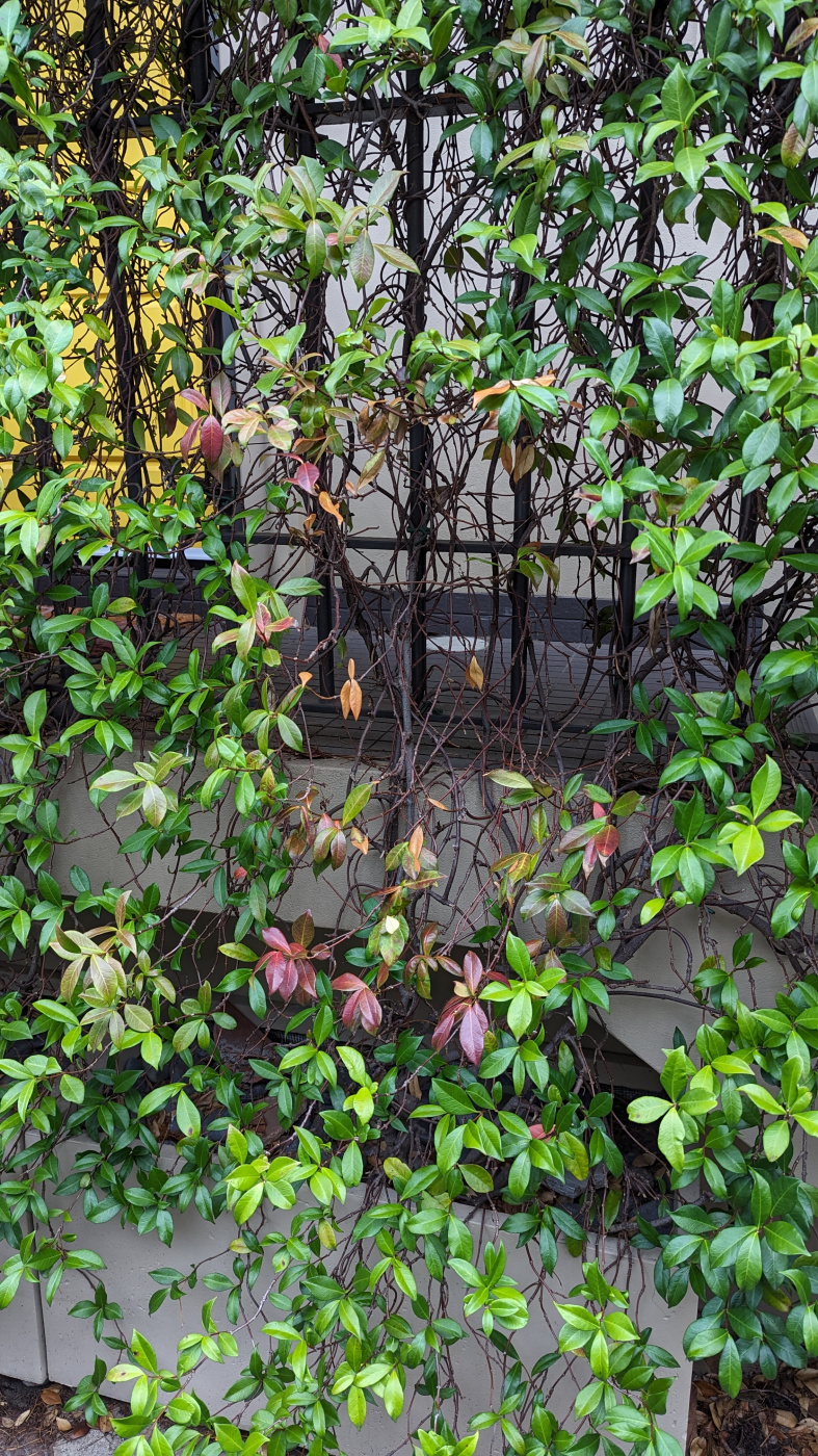 Where the plant is barest behind it we can see four black posts which look like railing supports.