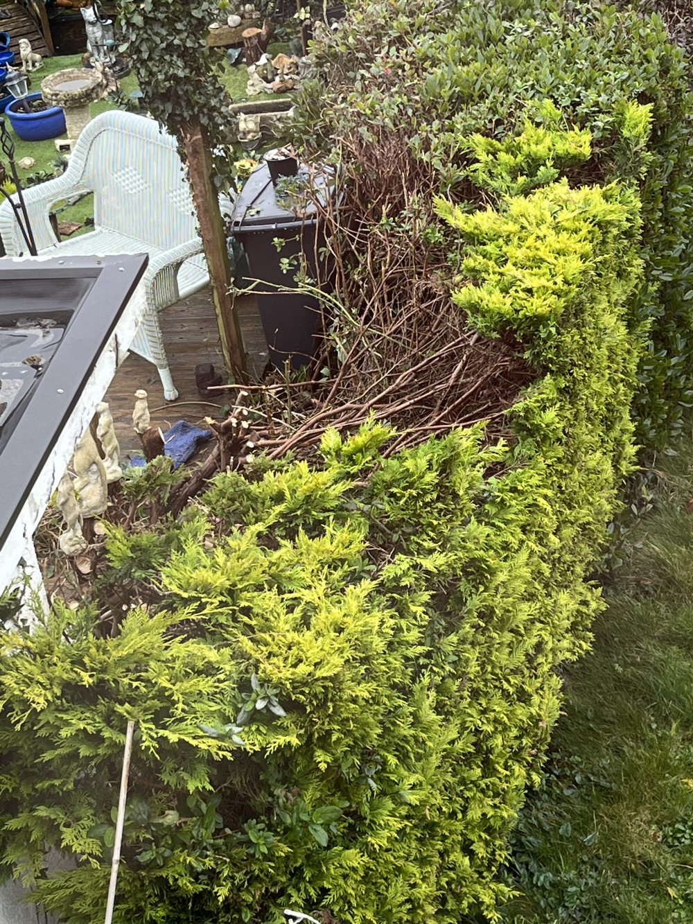 he has for some reason to cut back his side, down to the roots. As a result he has cut away chunks of my hedge that grew from the roots on his side.